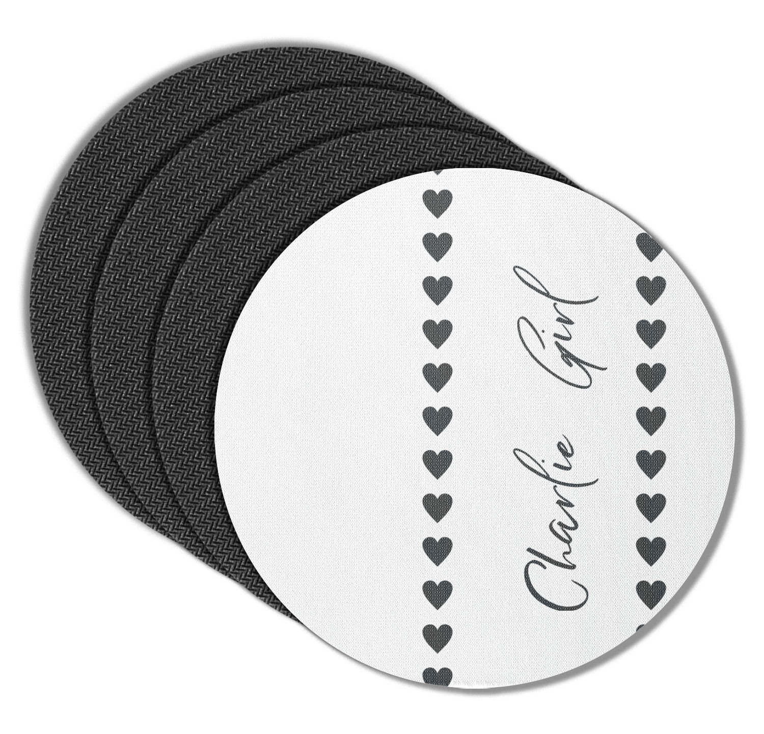 These drink coasters have a smooth, polyester top and a textured, rubber backing on its bottom. The non-slip rubber backing underneath works to keep any spills at bay. At 4 by 4 by 0.25 inches thick, these custom coasters are a suitable size for most drinkware. Your personalization is displayed atop the face of the cup coaster. We sell these rubber coasters in two different shapes: square and round. You can buy each shape as singulars or as a set of 4.