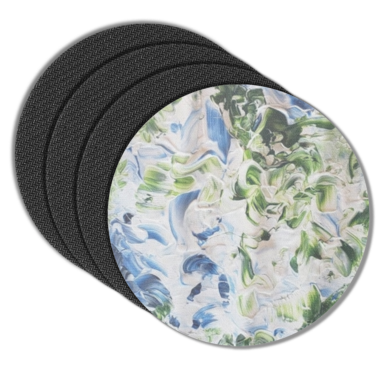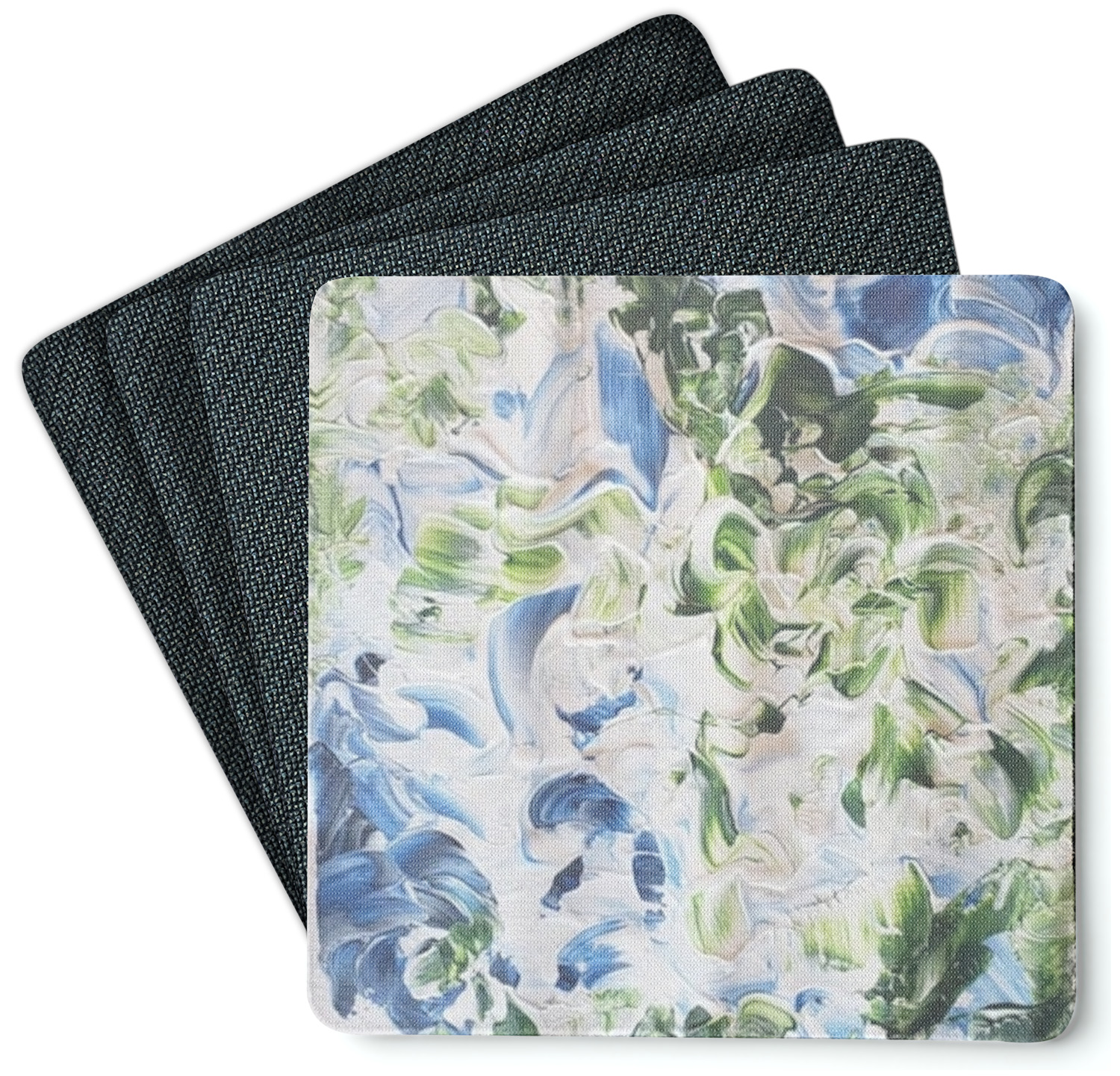 These drink coasters have a smooth, polyester top and a textured, rubber backing on its bottom. The non-slip rubber backing underneath works to keep any spills at bay. At 4 by 4 by 0.25 inches thick, these custom coasters are a suitable size for most drinkware. Your personalization is displayed atop the face of the cup coaster. We sell these rubber coasters in two different shapes: square and round. You can buy each shape as singulars or as a set of 4.