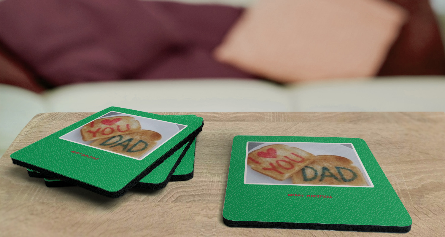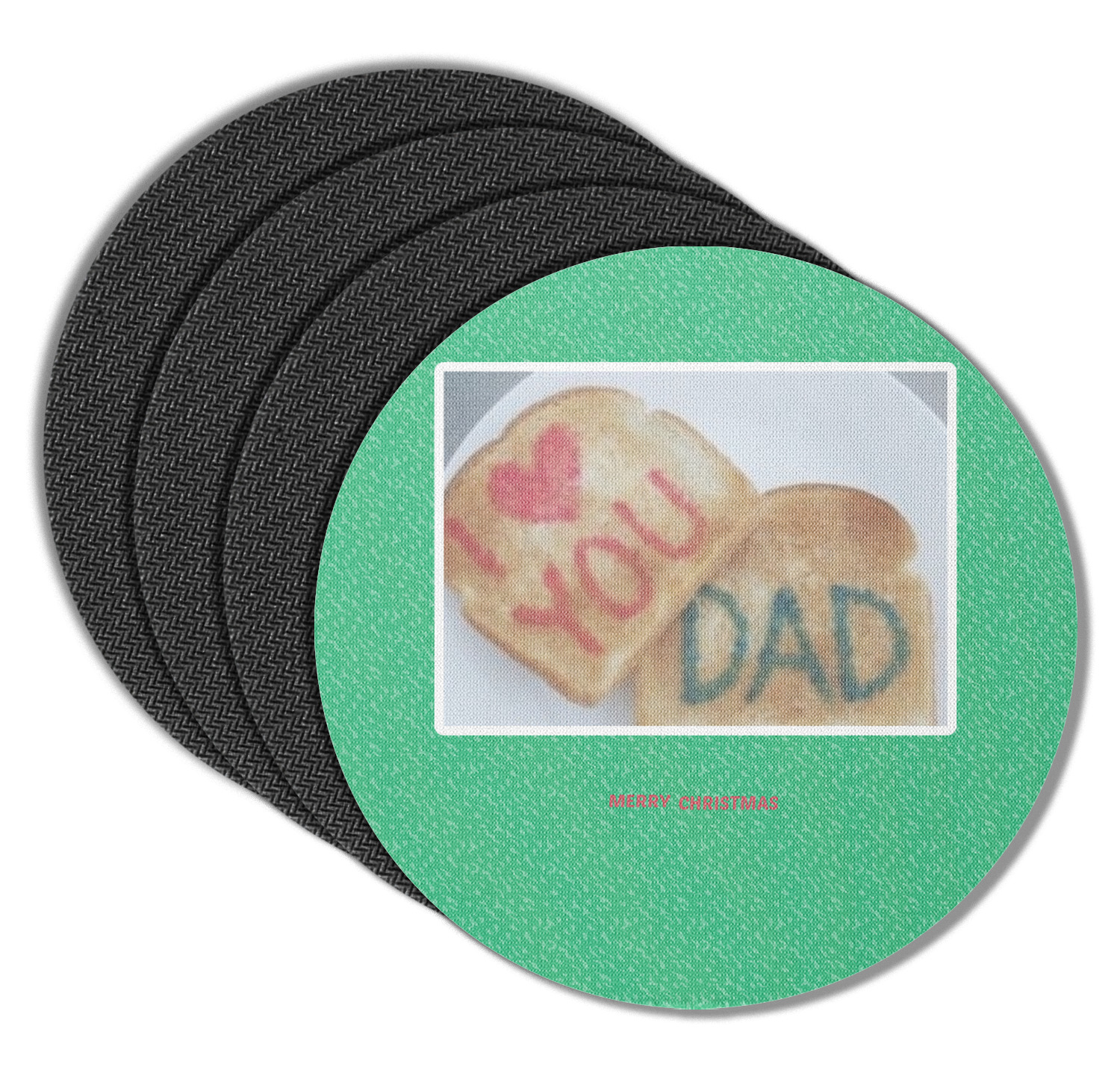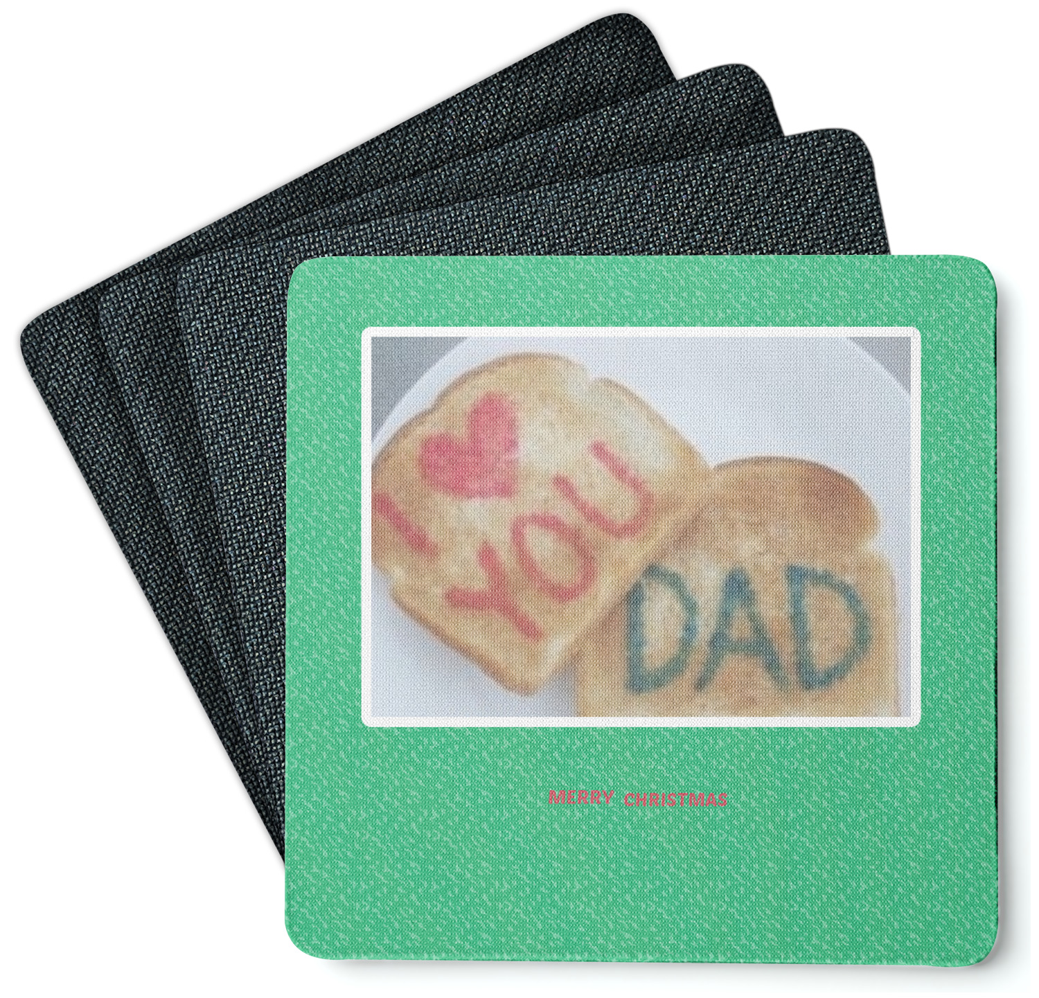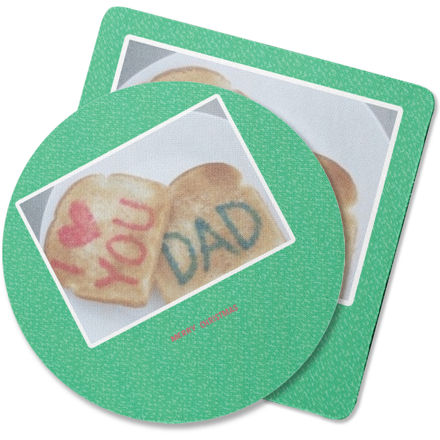 These drink coasters have a smooth, polyester top and a textured, rubber backing on its bottom. The non-slip rubber backing underneath works to keep any spills at bay. At 4 by 4 by 0.25 inches thick, these custom coasters are a suitable size for most drinkware. Your personalization is displayed atop the face of the cup coaster. We sell these rubber coasters in two different shapes: square and round. You can buy each shape as singulars or as a set of 4.