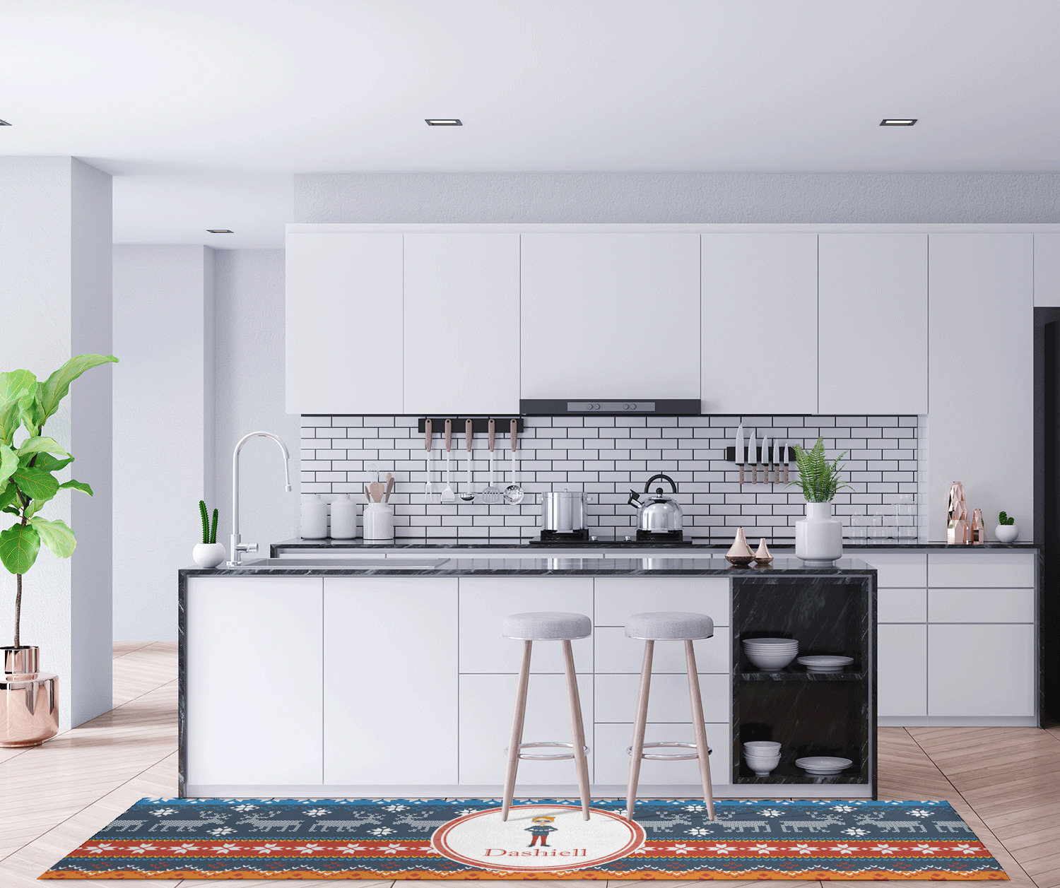 If you want to design it for your hallway - a vertical design is the perfect fit. If designing for to go in front of your kitchen island a horizontal design would suit you best! In our design system you can rotate the design either way to get the product you want.