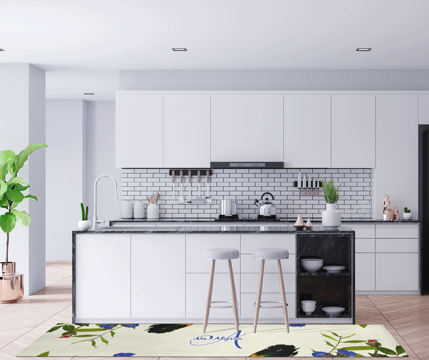 If you want to design it for your hallway - a vertical design is the perfect fit. If designing for to go in front of your kitchen island a horizontal design would suit you best! In our design system you can rotate the design either way to get the product you want.