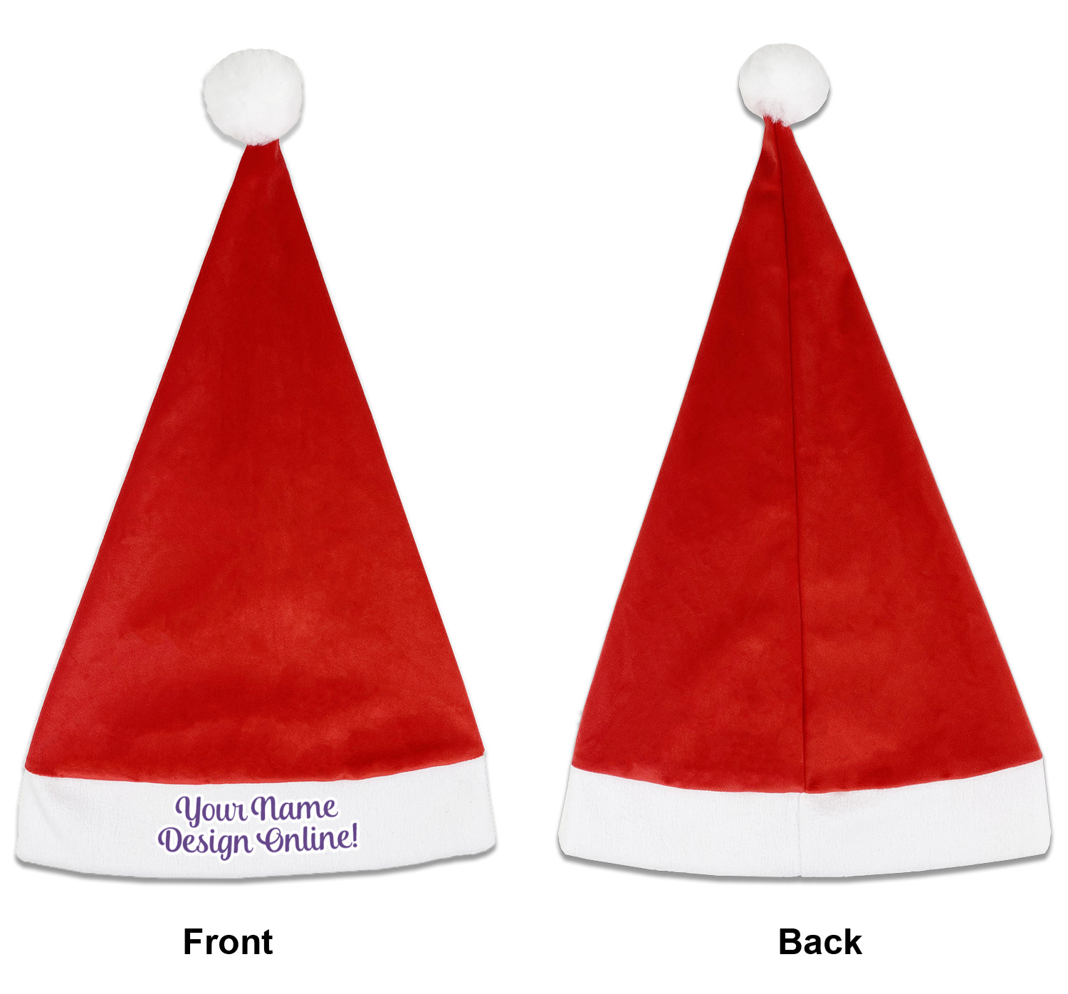 Our Santa hats are a soft, velvety polyester material. These customizable Santa hats are a classic red with white brimming and pom pom ball hanging off the hat tail just like Santa Claus! Each personalized Santa hat is approximately 17.5 L x 11.8 W. We offer two different styles to print your designs on the white brim - front or front & back.