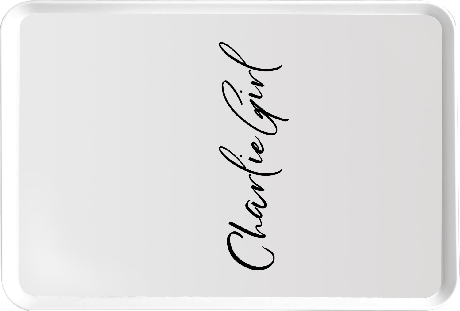 Made from a heavy melamine, these decorative trays are break resistant and are BPA free. At 14" x 9.25", these serving dishes are spacious enough to accommodate several drinks, bowls, or more. The tray features ridges underneath that allow for a sturdy stance upon any table or counter-top. We display your customization at the bottom of the tray's interior, while the remaining sides of the tray are a chic white.