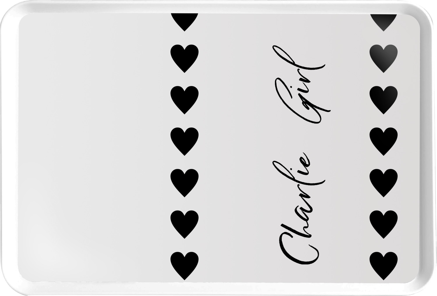 Made from a heavy melamine, these decorative trays are break resistant and are BPA free. At 14" x 9.25", these serving dishes are spacious enough to accommodate several drinks, bowls, or more. The tray features ridges underneath that allow for a sturdy stance upon any table or counter-top. We display your customization at the bottom of the tray's interior, while the remaining sides of the tray are a chic white.