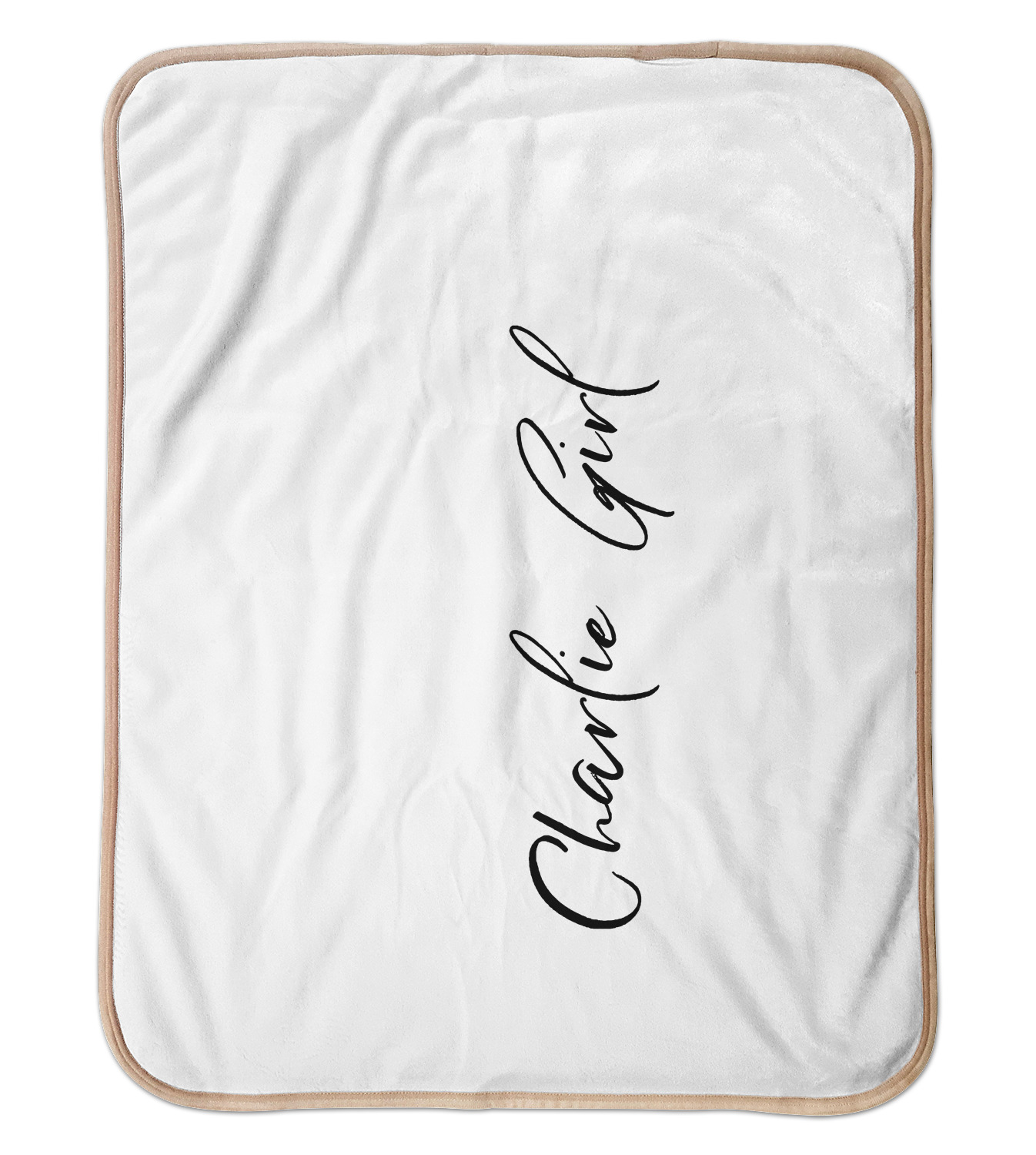 These toddler blankets are made of two different materials; the front side is made of a velvety, minky-like material that displays your customization and is perfect for a baby's delicate skin. The underside is crafted from a fluffy, sherpa fleece, and bears a classy, tan color. The dual texture gives your baby added comfort, as both sides are incredibly soft and plush. The corners of this blanket are rounded, and the ribbing of the blanket is a tan color, which complements the sandy color of the sherpa fleece. At approximately 30 by 40 inches, this custom baby blanket is the perfect size for babies and toddlers.