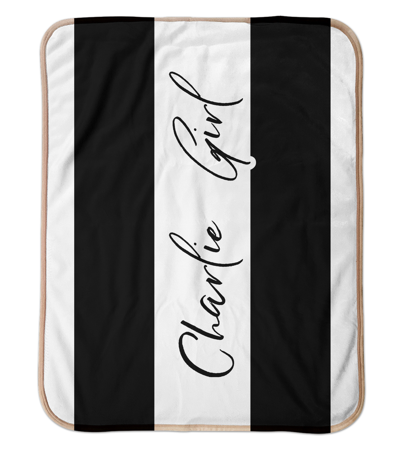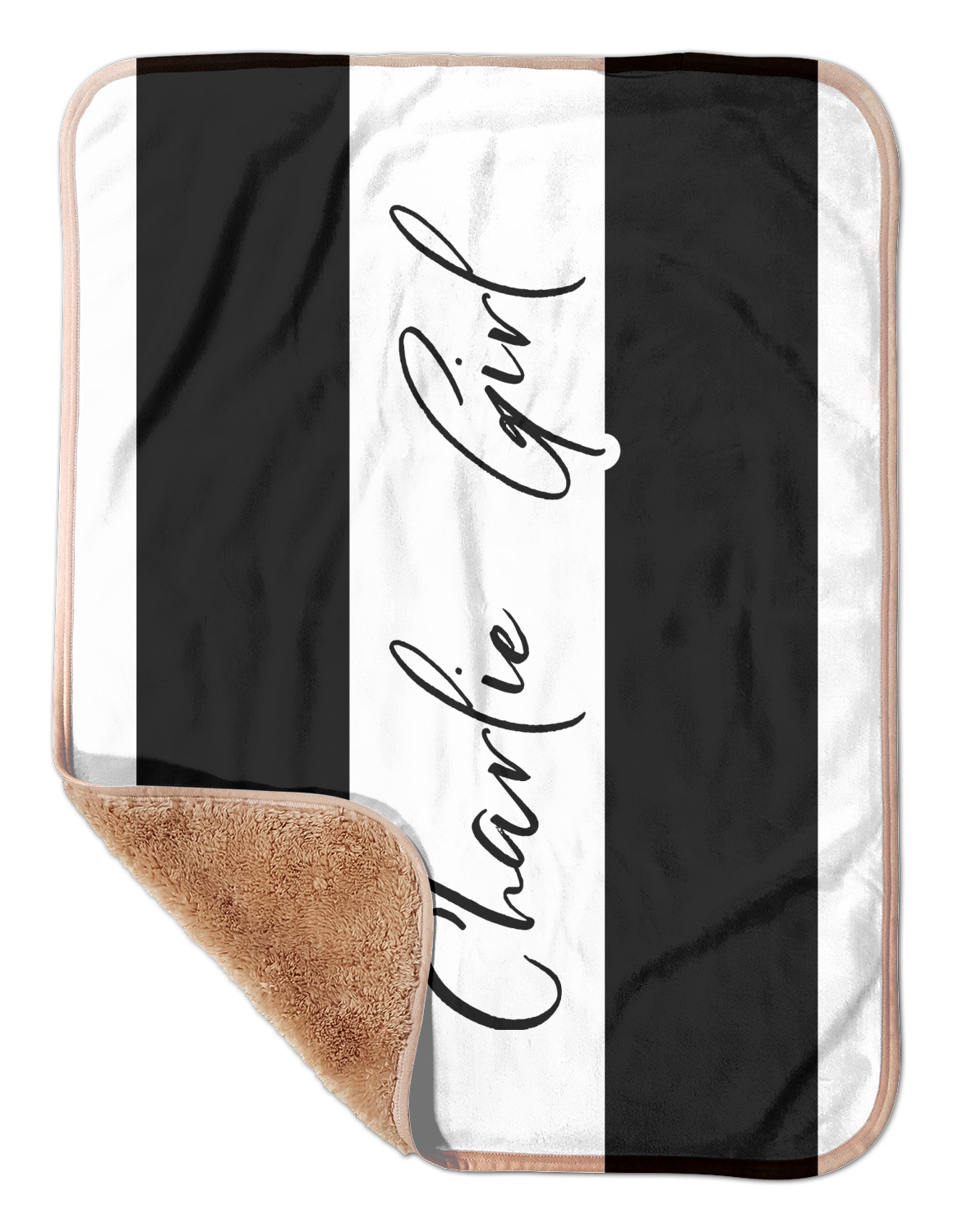 These toddler blankets are made of two different materials; the front side is made of a velvety, minky-like material that displays your customization and is perfect for a baby's delicate skin. The underside is crafted from a fluffy, sherpa fleece, and bears a classy, tan color. The dual texture gives your baby added comfort, as both sides are incredibly soft and plush. The corners of this blanket are rounded, and the ribbing of the blanket is a tan color, which complements the sandy color of the sherpa fleece. At approximately 30 by 40 inches, this custom baby blanket is the perfect size for babies and toddlers.