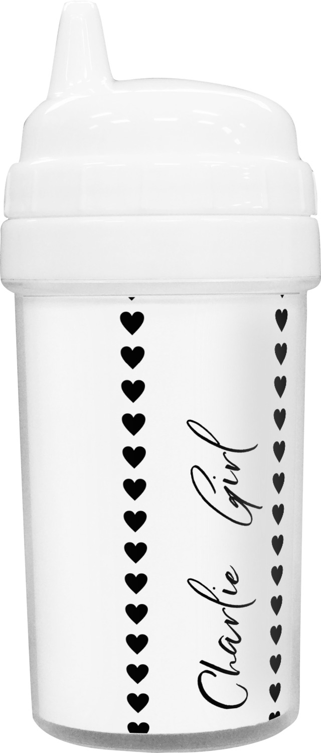Our toddler cups are free of BPA, and have a twist-open lid so that you can easily fill and clean these cups for your young ones. Each cup also comes with a sippy nozzle to reduce spills. We offer these custom sippy cups in two different sizes; we have a baby sippy cup that holds 5 ounces, and a toddler sippy cup that holds 10 ounces. Your customization is printed on a premium glossy media insert that is placed within these toddler drinking cups.