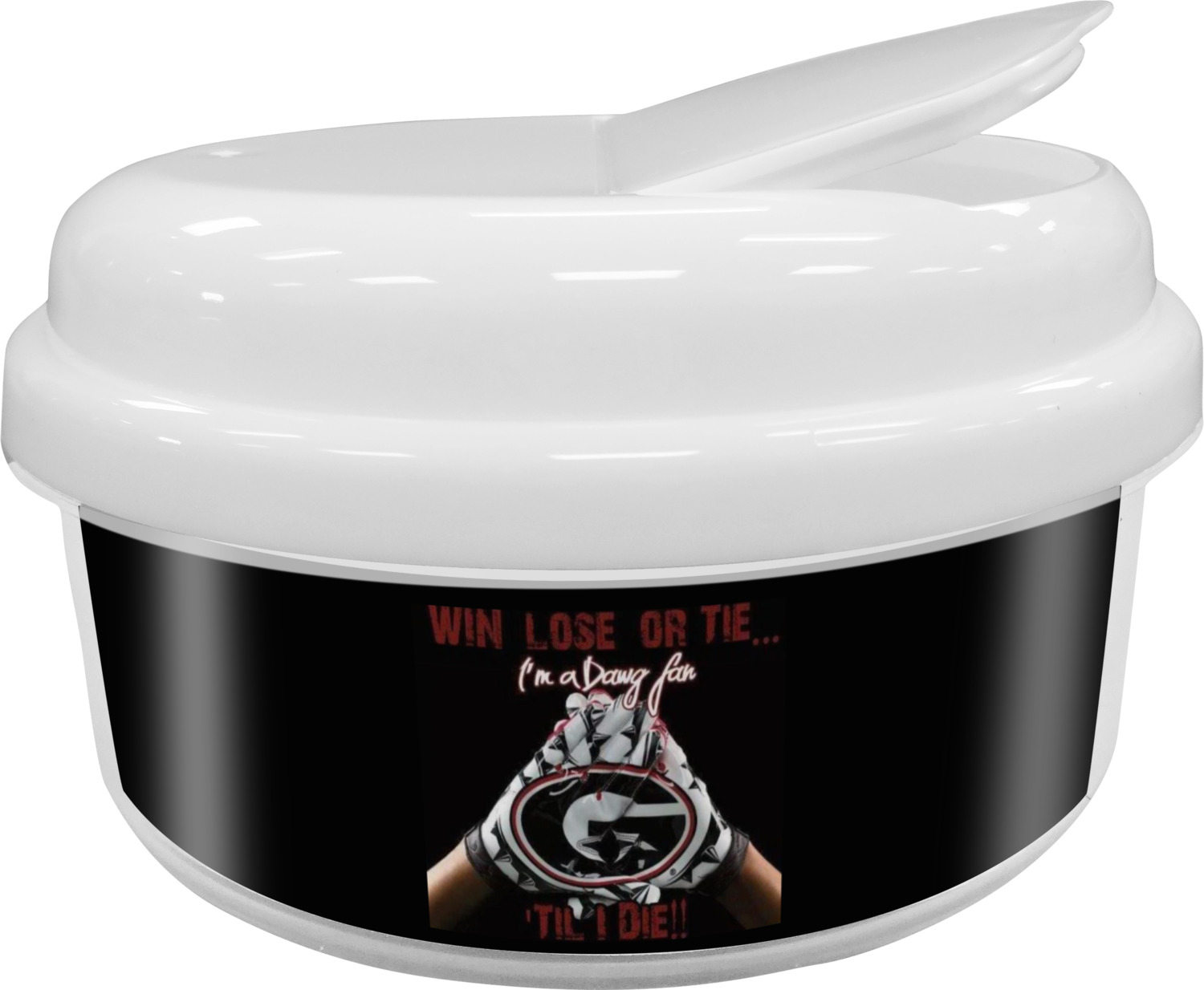 As always, this product is free of any harmful BPA. We print your customization on an insert on the sides of the container, while the top and bottom is a pristine white.