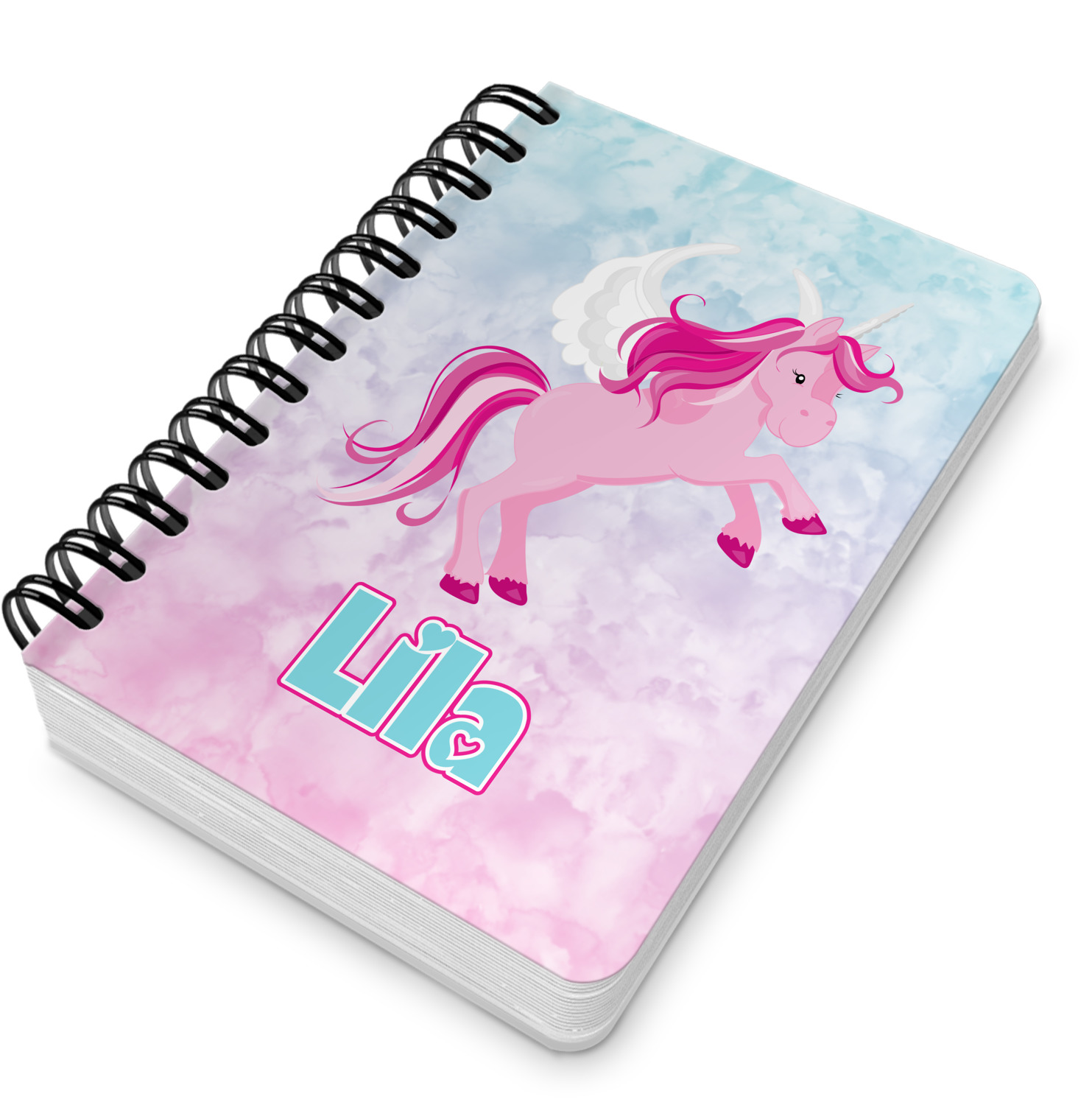 This spiral notebook includes 75 sheets of thick, ruled paper. The front and back of this custom notebook is made of a robust, laminate, plastic covering. We print your personalization on these two panels, underneath a glossy finish, which emphasizes the colors of your design. The two panels and the sheets of paper are held together by a sturdy, black coil. The paper within your bound notebook is perforated for easy, clean tearing.