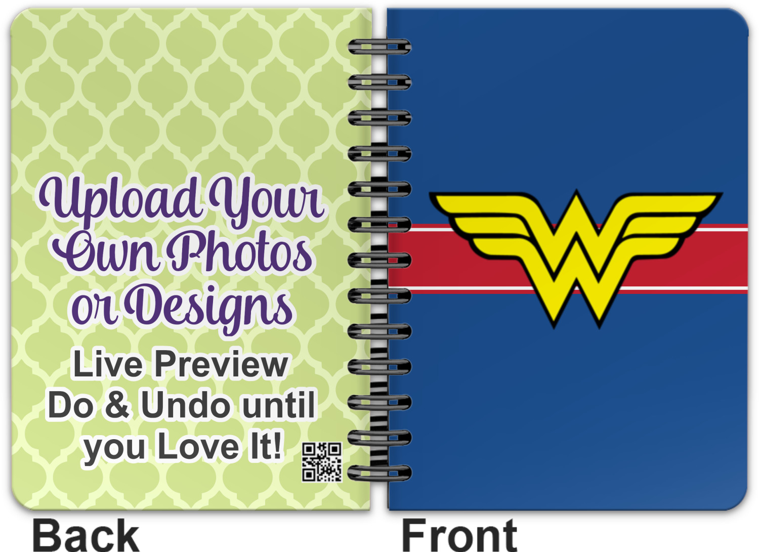 This spiral notebook includes 75 sheets of thick, ruled paper. The front and back of this custom notebook is made of a robust, laminate, plastic covering. We print your personalization on these two panels, underneath a glossy finish, which emphasizes the colors of your design. The two panels and the sheets of paper are held together by a sturdy, black coil. The paper within your bound notebook is perforated for easy, clean tearing.