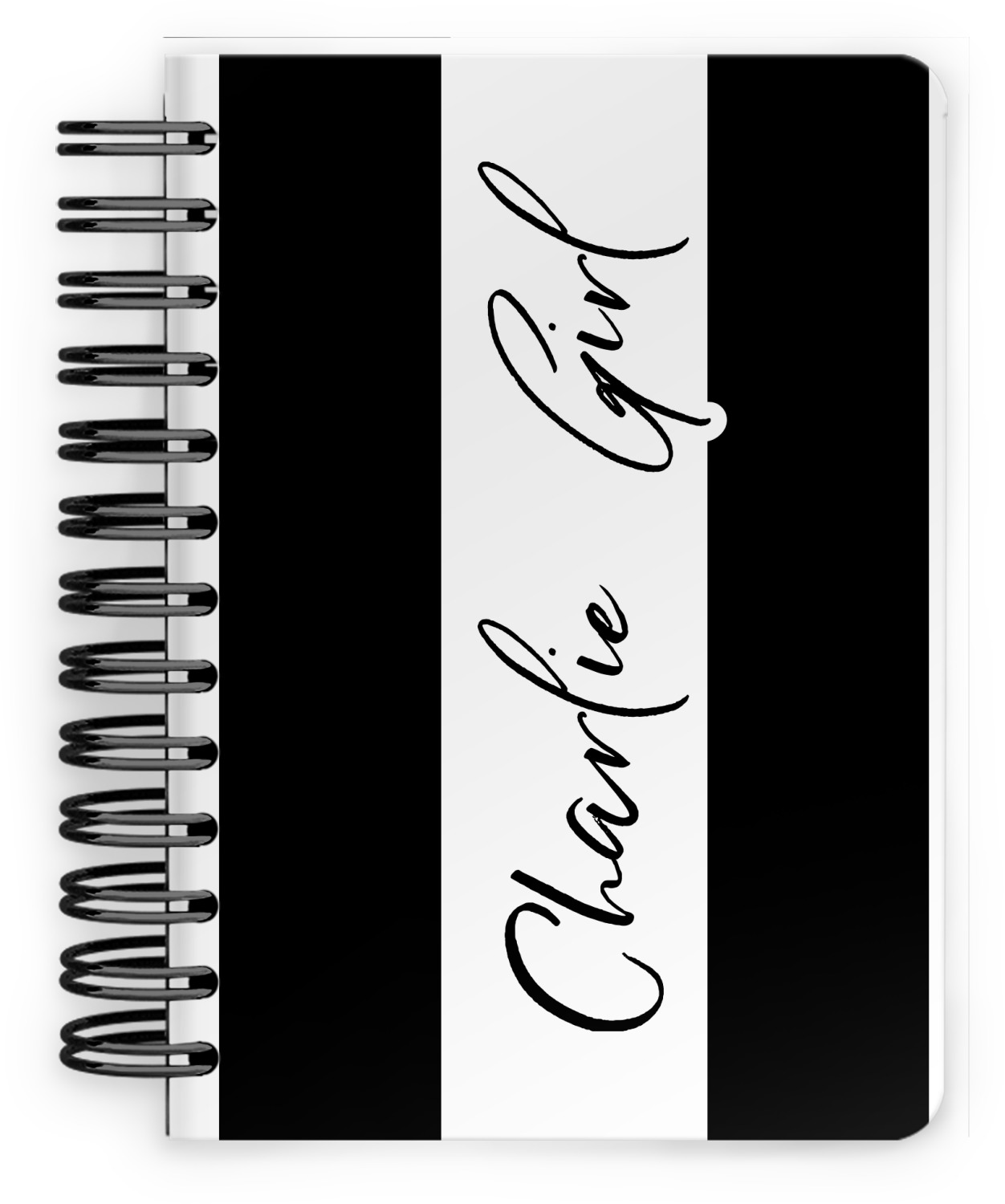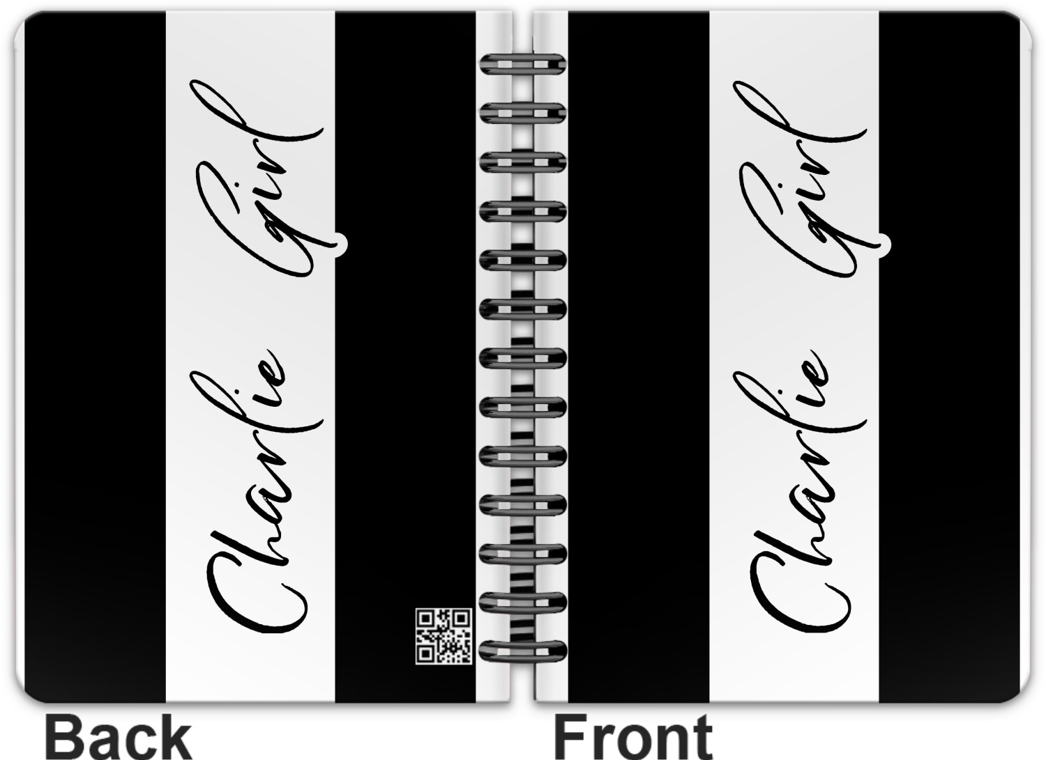 This spiral notebook includes 75 sheets of thick, ruled paper. The front and back of this custom notebook is made of a robust, laminate, plastic covering. We print your personalization on these two panels, underneath a glossy finish, which emphasizes the colors of your design. The two panels and the sheets of paper are held together by a sturdy, black coil. The paper within your bound notebook is perforated for easy, clean tearing.