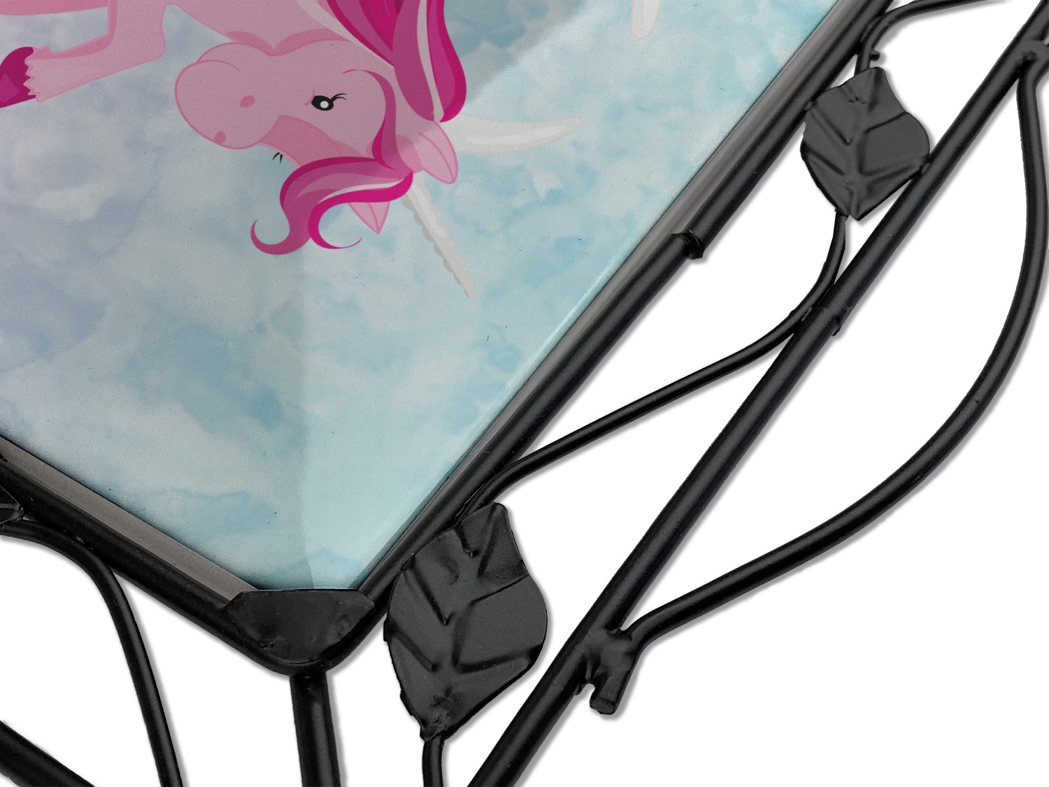Our square trivets are made from a durable, wrought iron. This model features 4 small half circles, one on each corner, and a larger ring of iron that circles the central, customized tile. Each of the 4 corners has a round foot on its bottom for stability. This trivet is 8.75 by 8.75 inches, but the central tile measures at 6 inches on both sides.