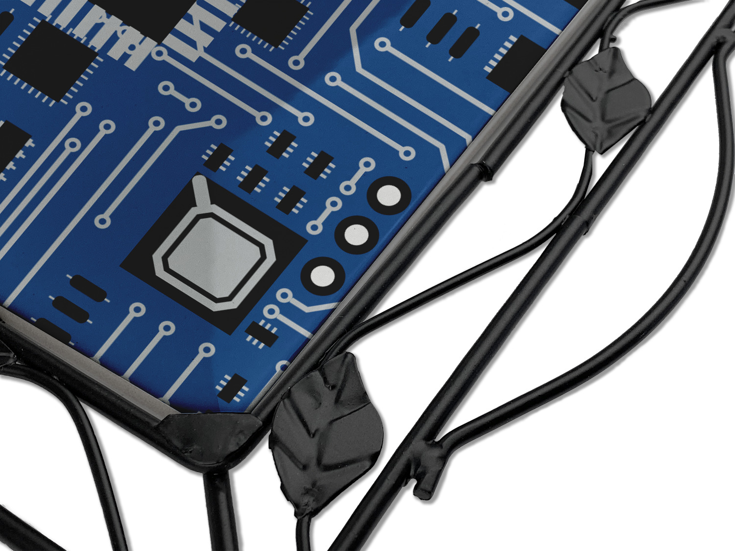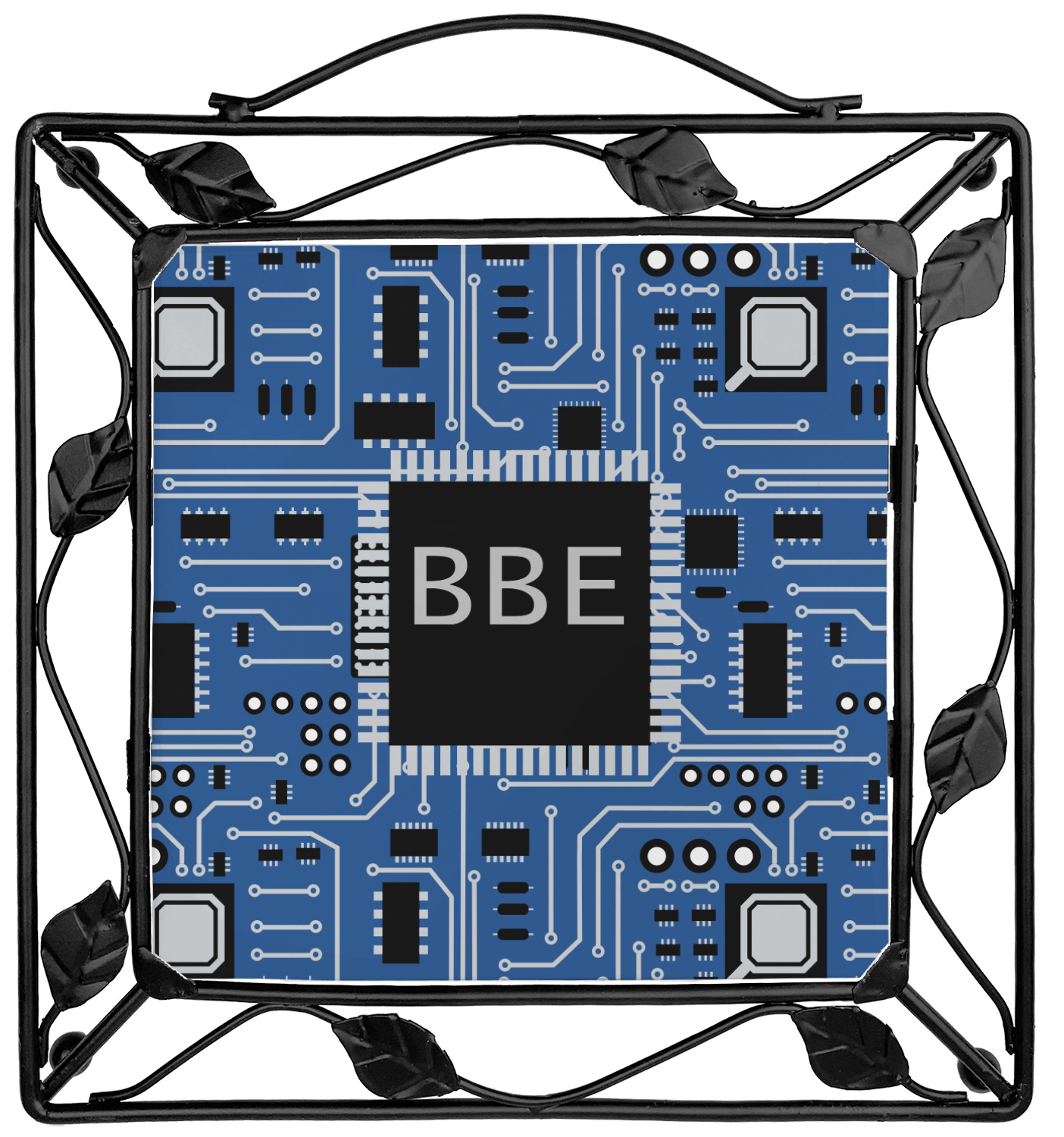 Our square trivets are made from a durable, wrought iron. This model features 4 small half circles, one on each corner, and a larger ring of iron that circles the central, customized tile. Each of the 4 corners has a round foot on its bottom for stability. This trivet is 8.75 by 8.75 inches, but the central tile measures at 6 inches on both sides.
