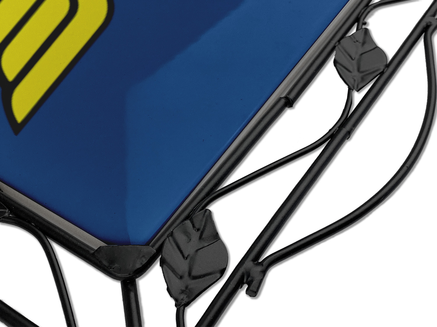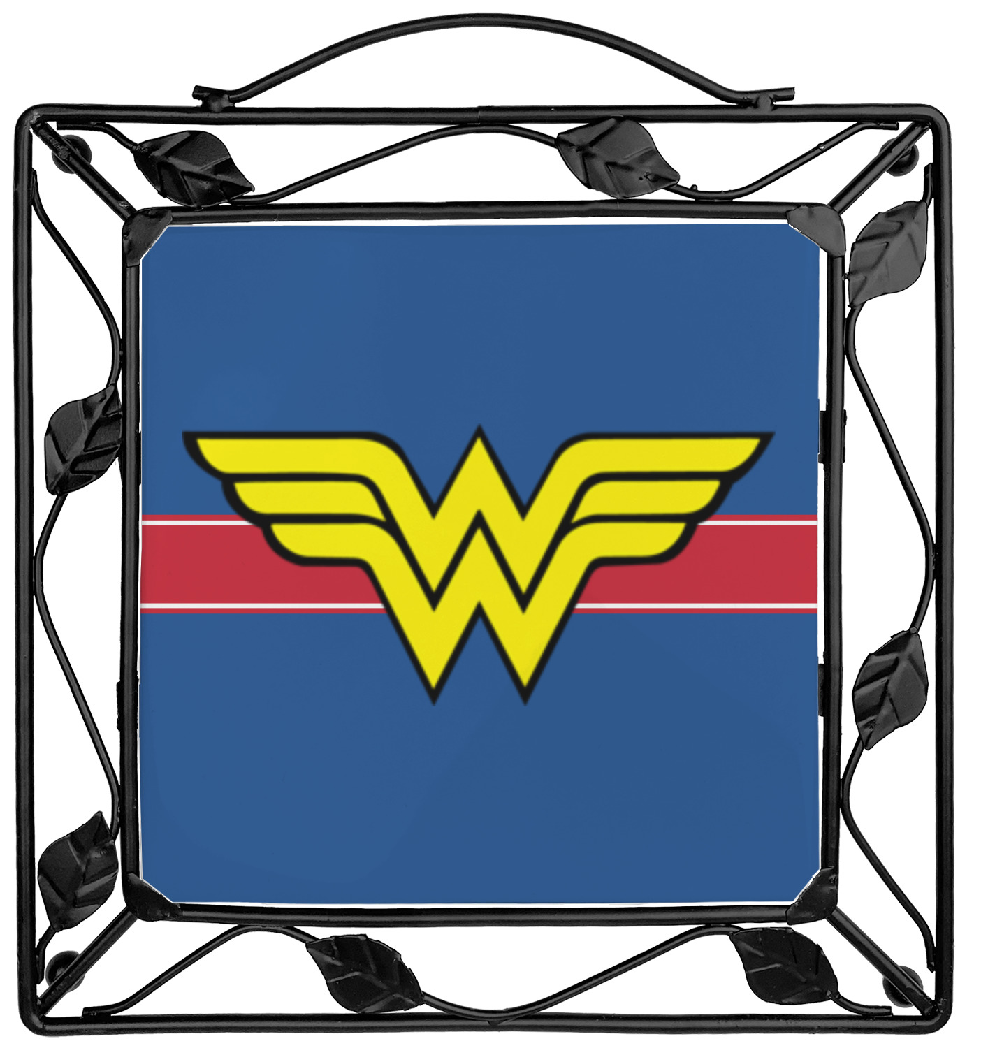 Our square trivets are made from a durable, wrought iron. This model features 4 small half circles, one on each corner, and a larger ring of iron that circles the central, customized tile. Each of the 4 corners has a round foot on its bottom for stability. This trivet is 8.75 by 8.75 inches, but the central tile measures at 6 inches on both sides.