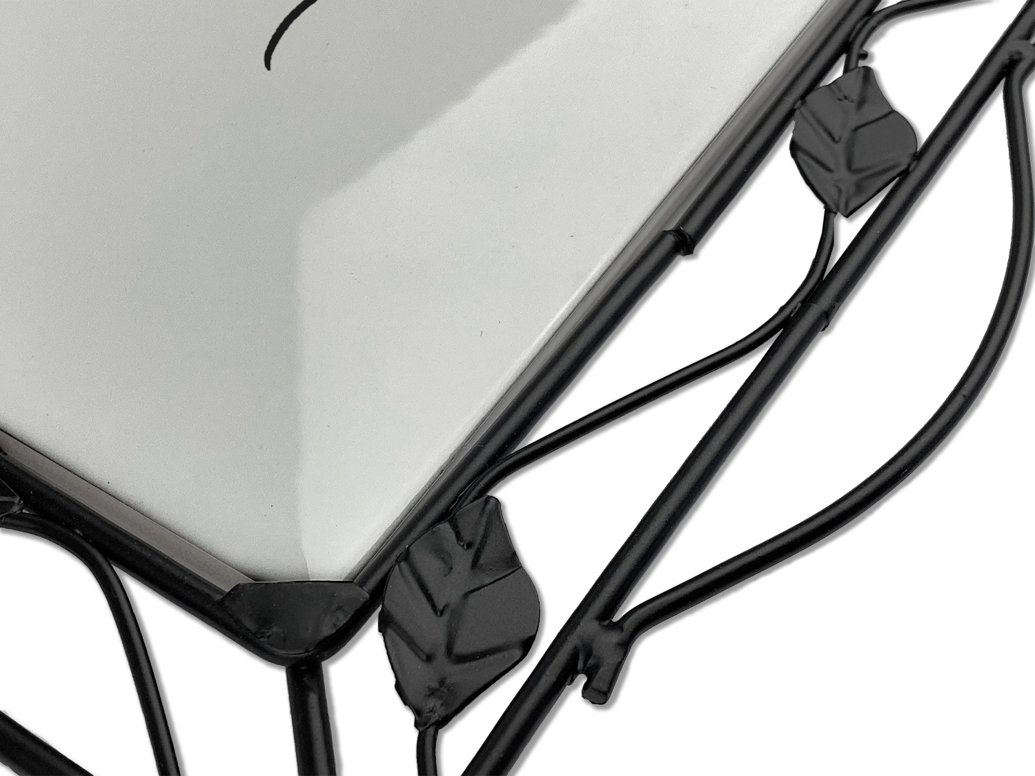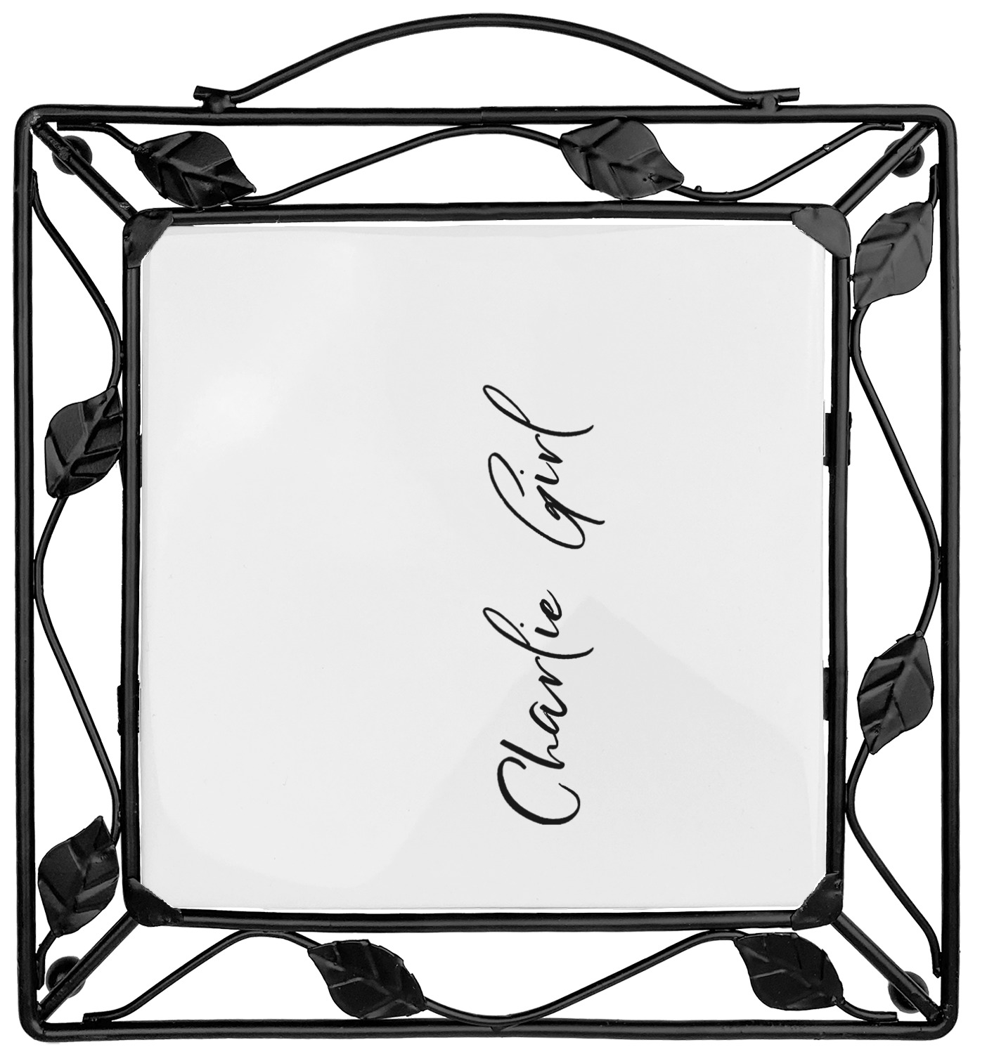 Our square trivets are made from a durable, wrought iron. This model features 4 small half circles, one on each corner, and a larger ring of iron that circles the central, customized tile. Each of the 4 corners has a round foot on its bottom for stability. This trivet is 8.75 by 8.75 inches, but the central tile measures at 6 inches on both sides.