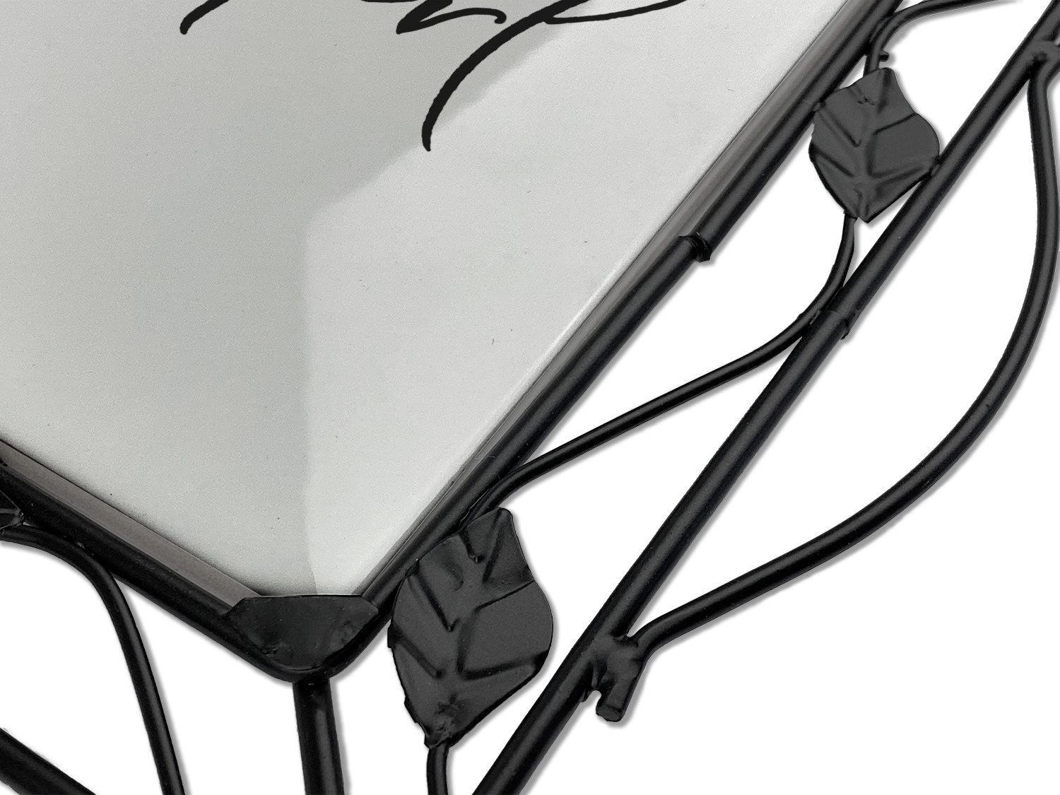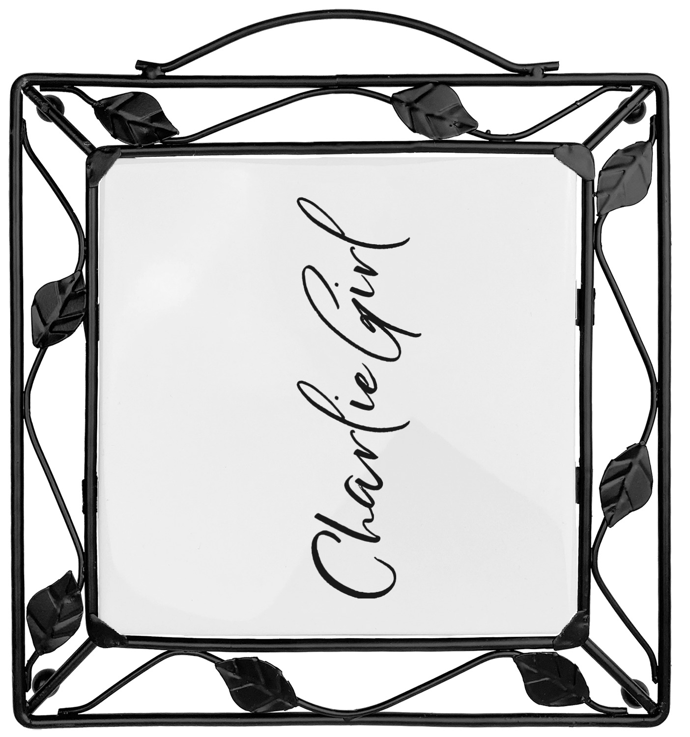 Our square trivets are made from a durable, wrought iron. This model features 4 small half circles, one on each corner, and a larger ring of iron that circles the central, customized tile. Each of the 4 corners has a round foot on its bottom for stability. This trivet is 8.75 by 8.75 inches, but the central tile measures at 6 inches on both sides.