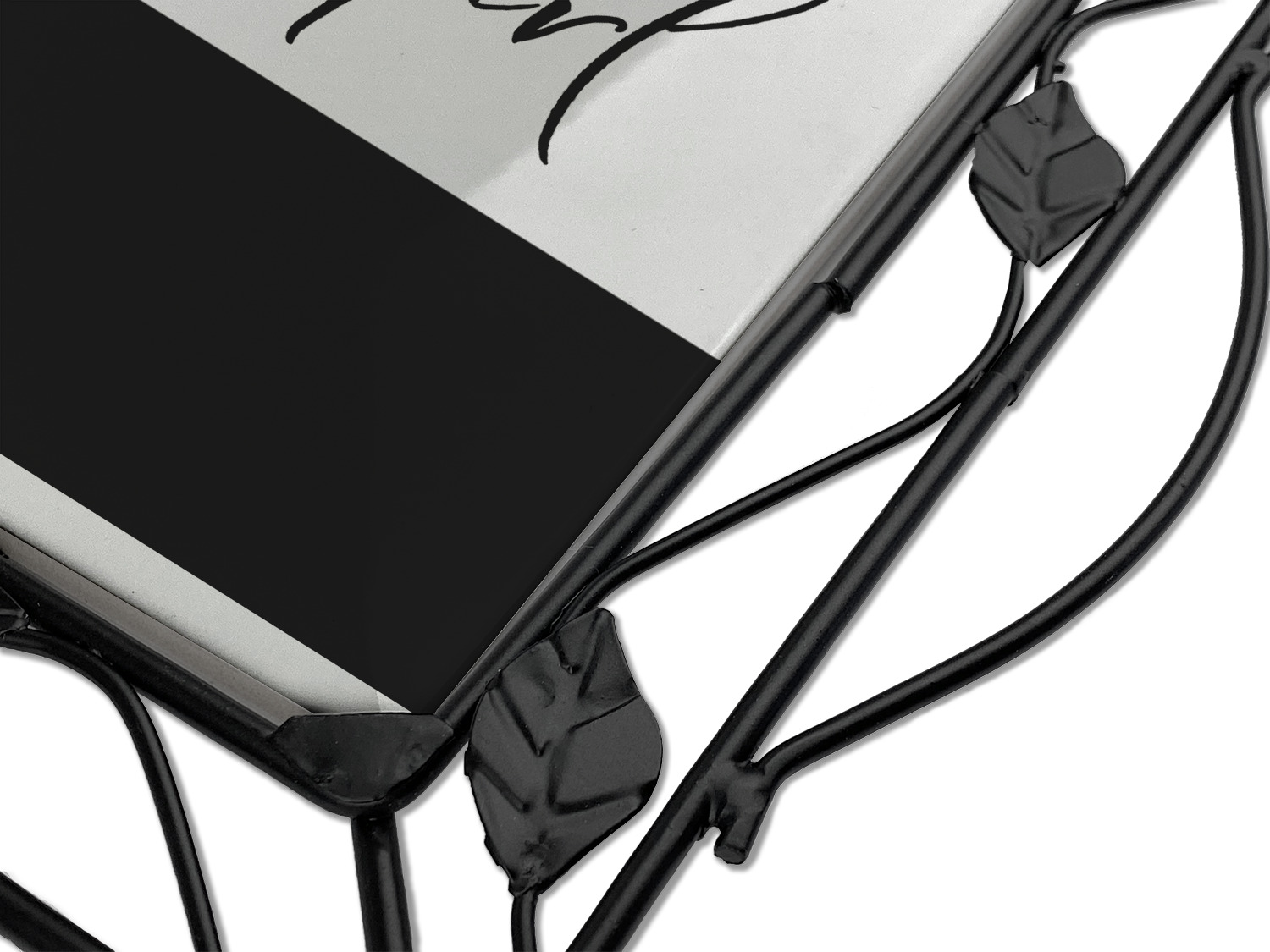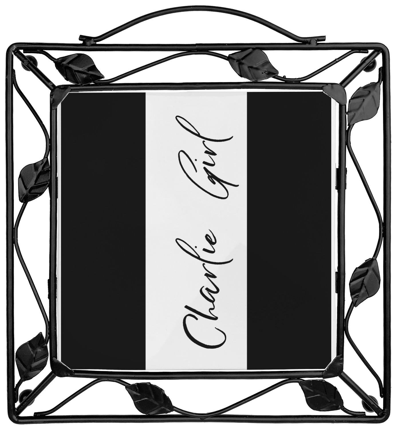 Our square trivets are made from a durable, wrought iron. This model features 4 small half circles, one on each corner, and a larger ring of iron that circles the central, customized tile. Each of the 4 corners has a round foot on its bottom for stability. This trivet is 8.75 by 8.75 inches, but the central tile measures at 6 inches on both sides.