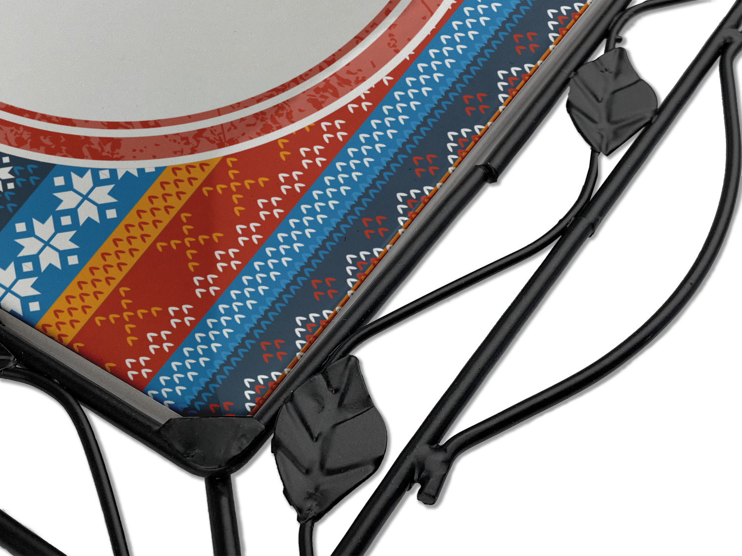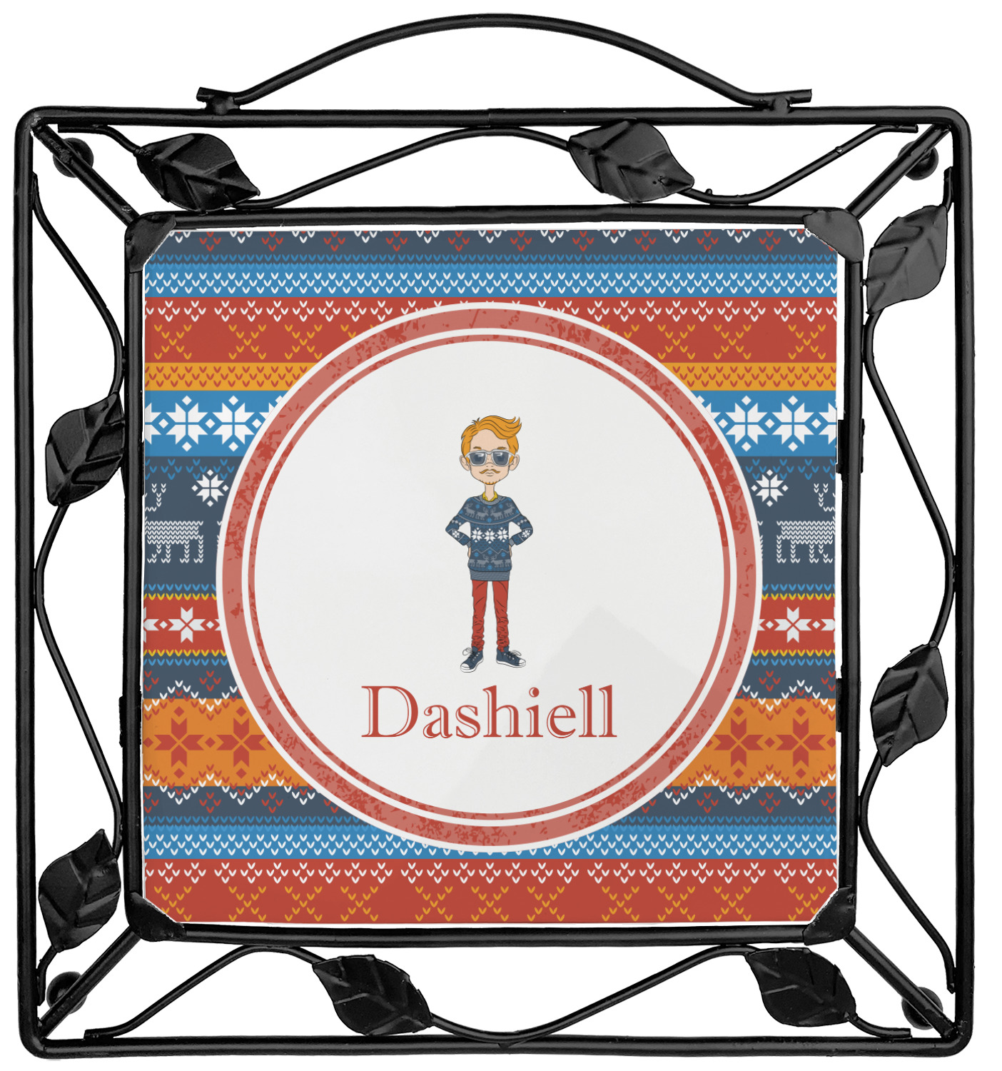 Our square trivets are made from a durable, wrought iron. This model features 4 small half circles, one on each corner, and a larger ring of iron that circles the central, customized tile. Each of the 4 corners has a round foot on its bottom for stability. This trivet is 8.75 by 8.75 inches, but the central tile measures at 6 inches on both sides.