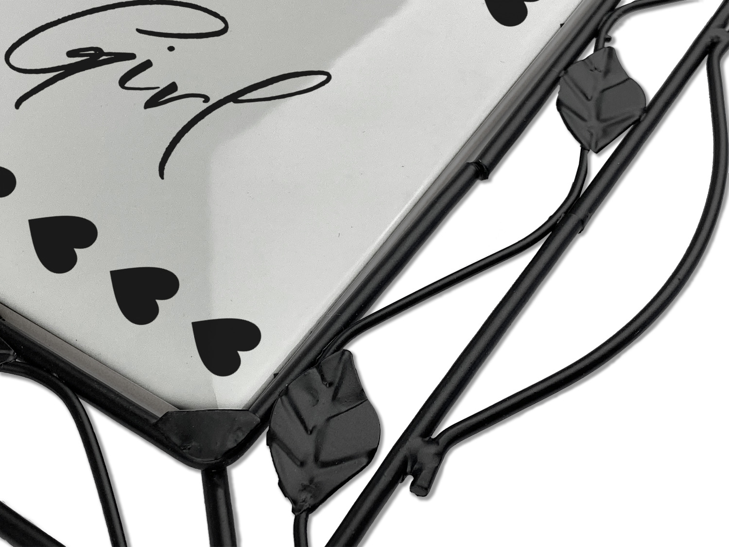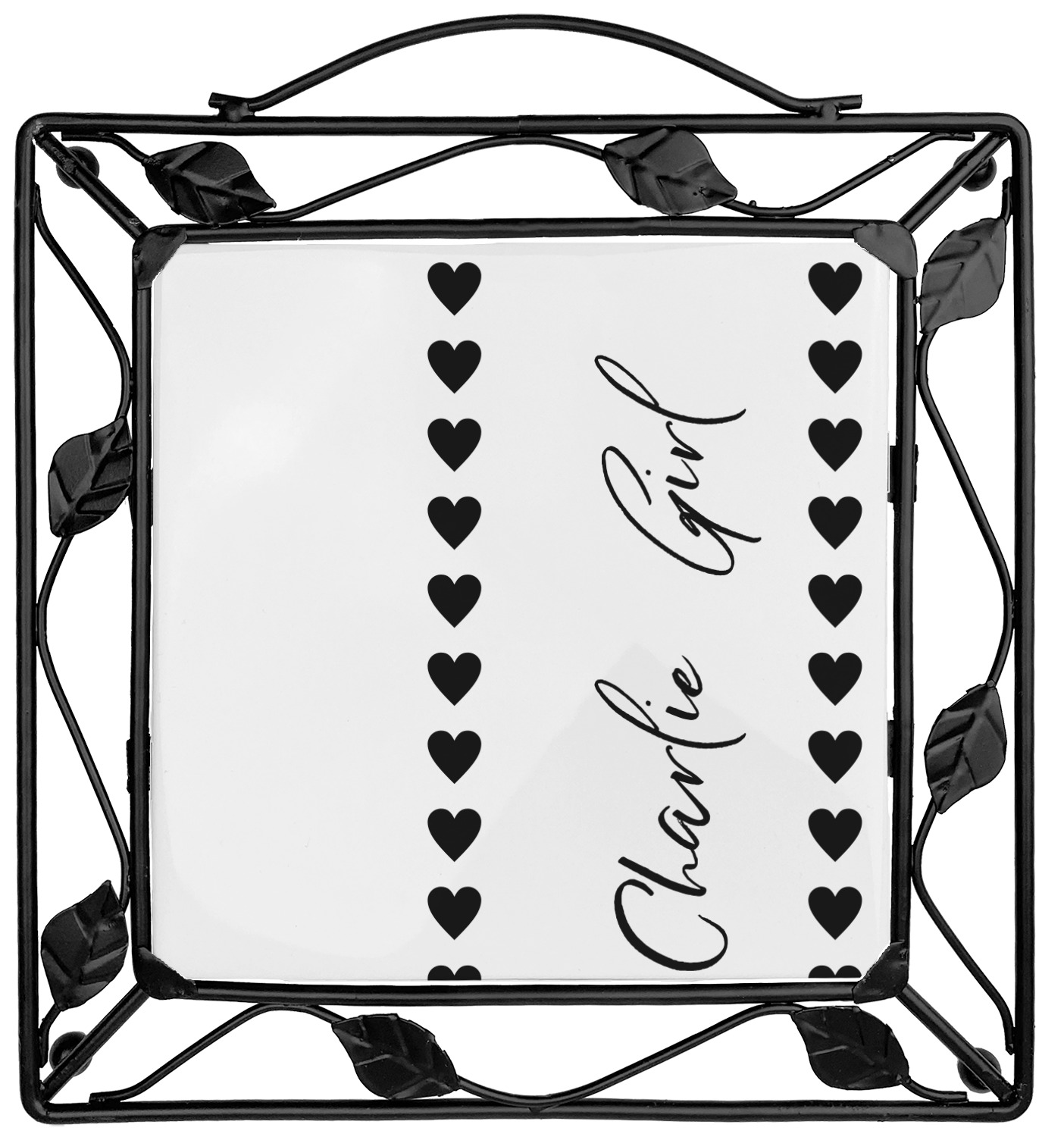 Our square trivets are made from a durable, wrought iron. This model features 4 small half circles, one on each corner, and a larger ring of iron that circles the central, customized tile. Each of the 4 corners has a round foot on its bottom for stability. This trivet is 8.75 by 8.75 inches, but the central tile measures at 6 inches on both sides.