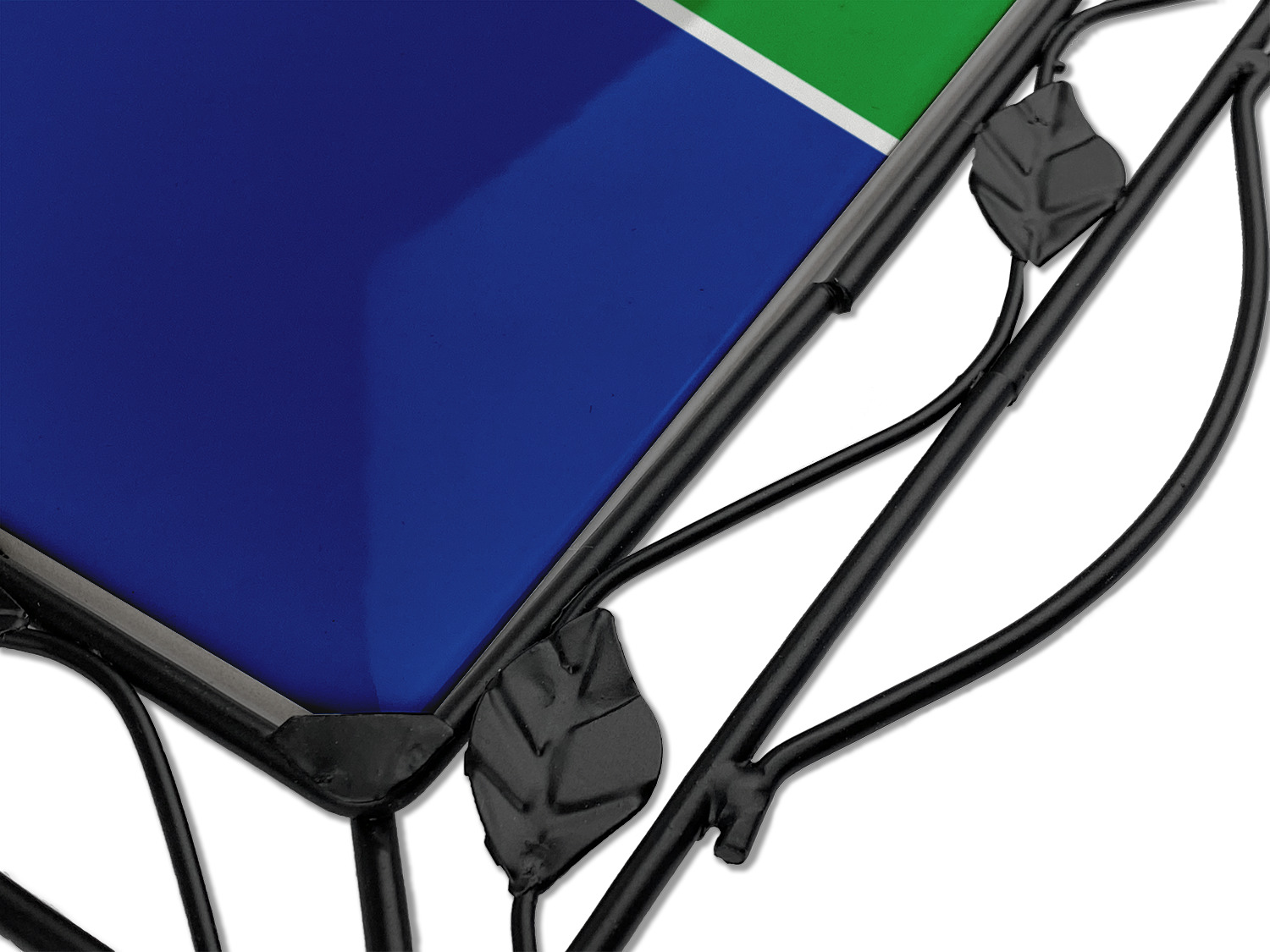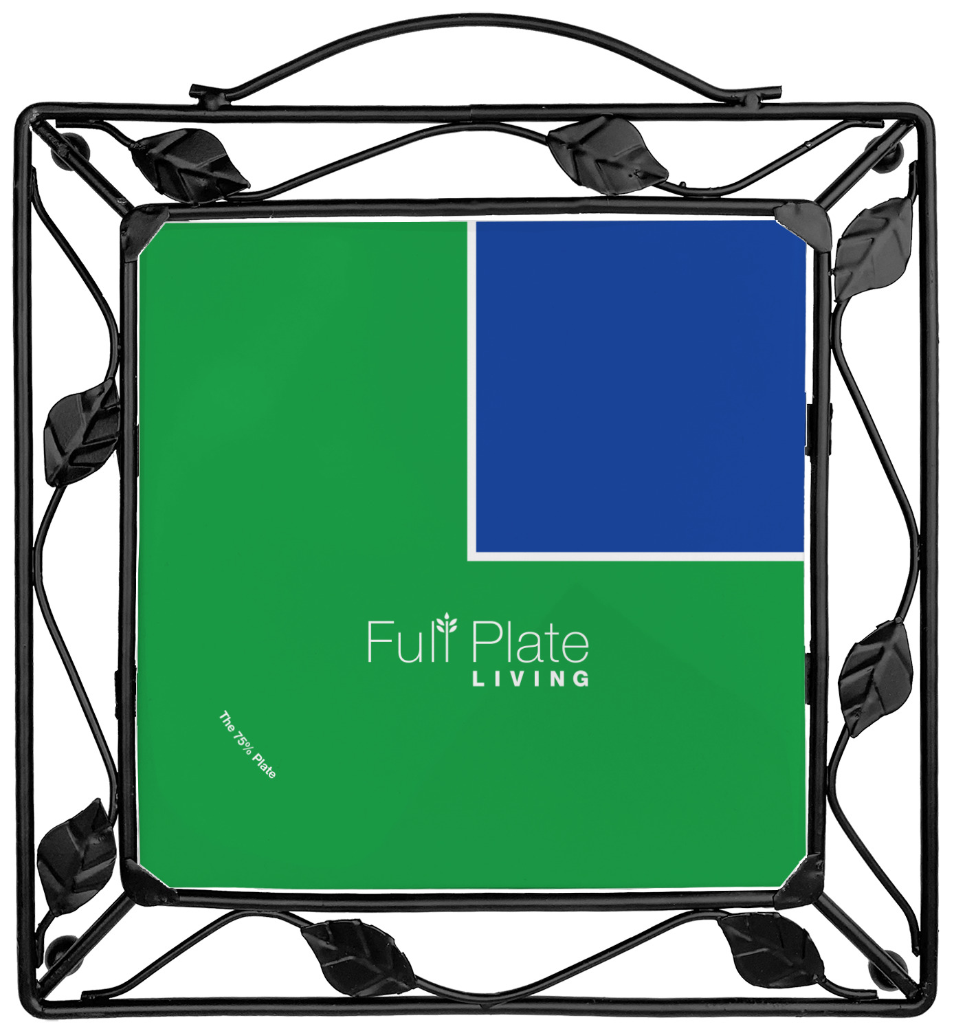 Our square trivets are made from a durable, wrought iron. This model features 4 small half circles, one on each corner, and a larger ring of iron that circles the central, customized tile. Each of the 4 corners has a round foot on its bottom for stability. This trivet is 8.75 by 8.75 inches, but the central tile measures at 6 inches on both sides.