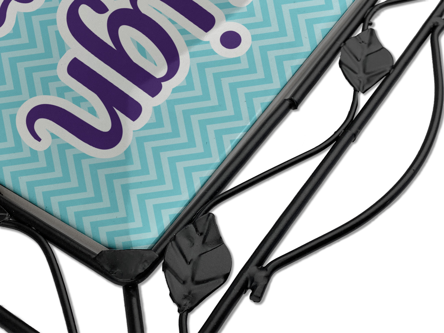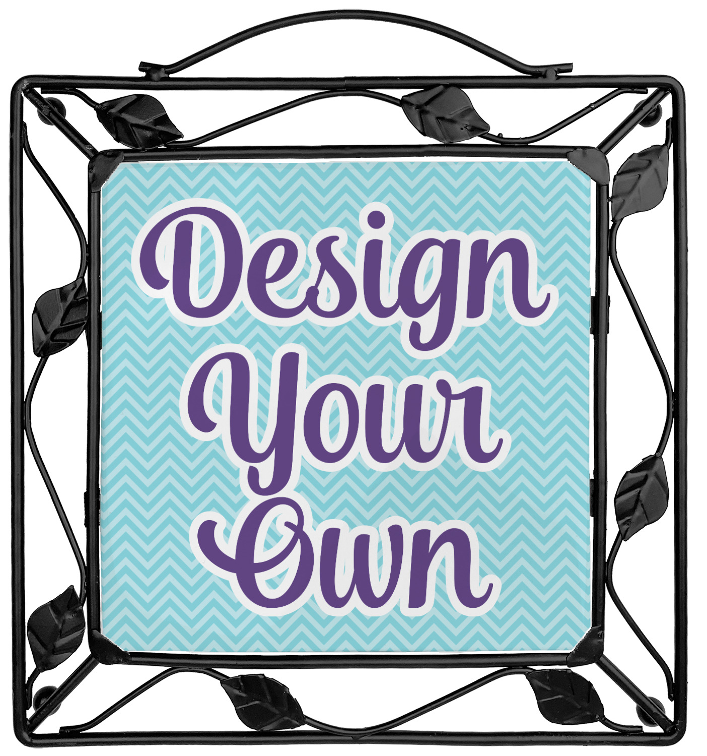 Our square trivets are made from a durable, wrought iron. This model features 4 small half circles, one on each corner, and a larger ring of iron that circles the central, customized tile. Each of the 4 corners has a round foot on its bottom for stability. This trivet is 8.75 by 8.75 inches, but the central tile measures at 6 inches on both sides.