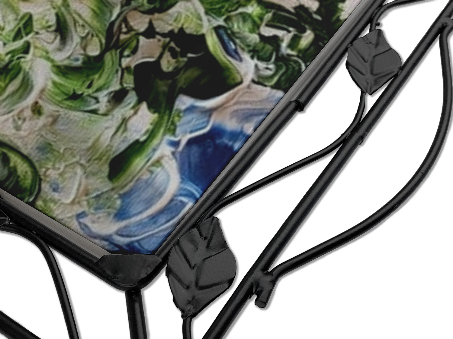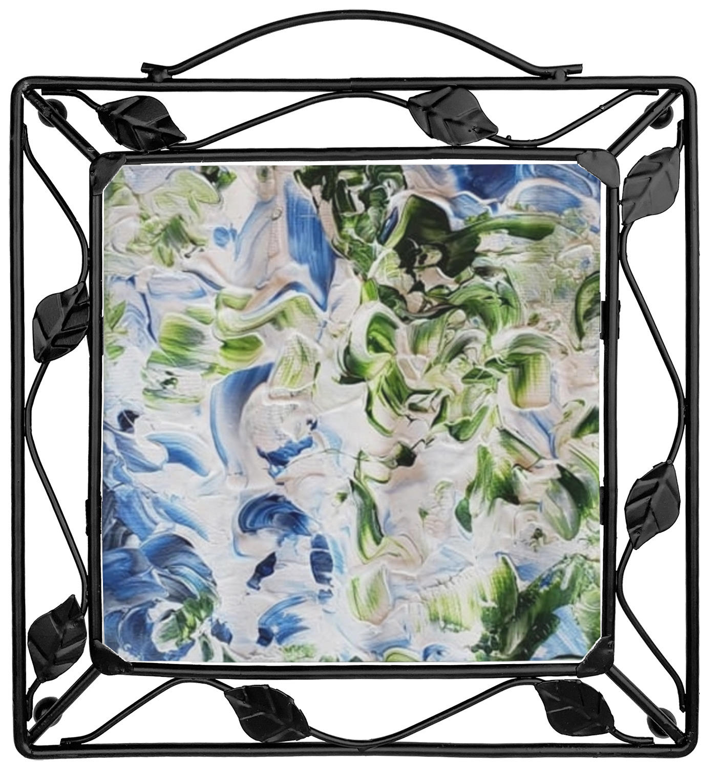 Our square trivets are made from a durable, wrought iron. This model features 4 small half circles, one on each corner, and a larger ring of iron that circles the central, customized tile. Each of the 4 corners has a round foot on its bottom for stability. This trivet is 8.75 by 8.75 inches, but the central tile measures at 6 inches on both sides.