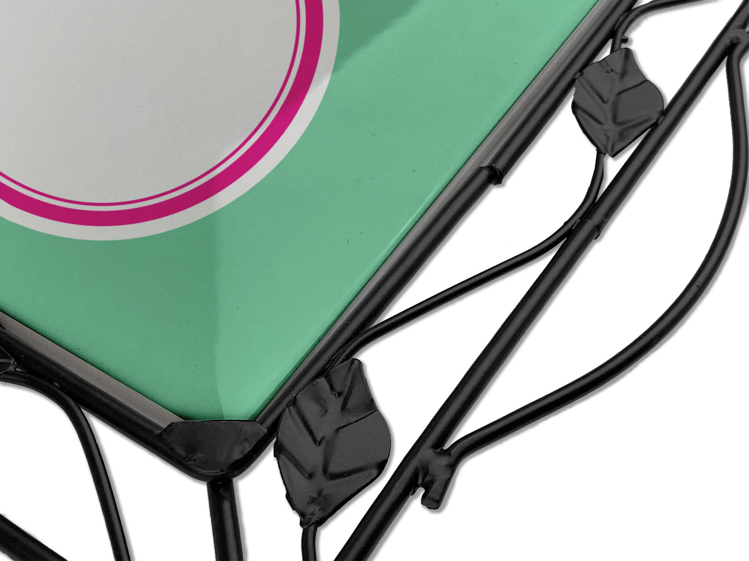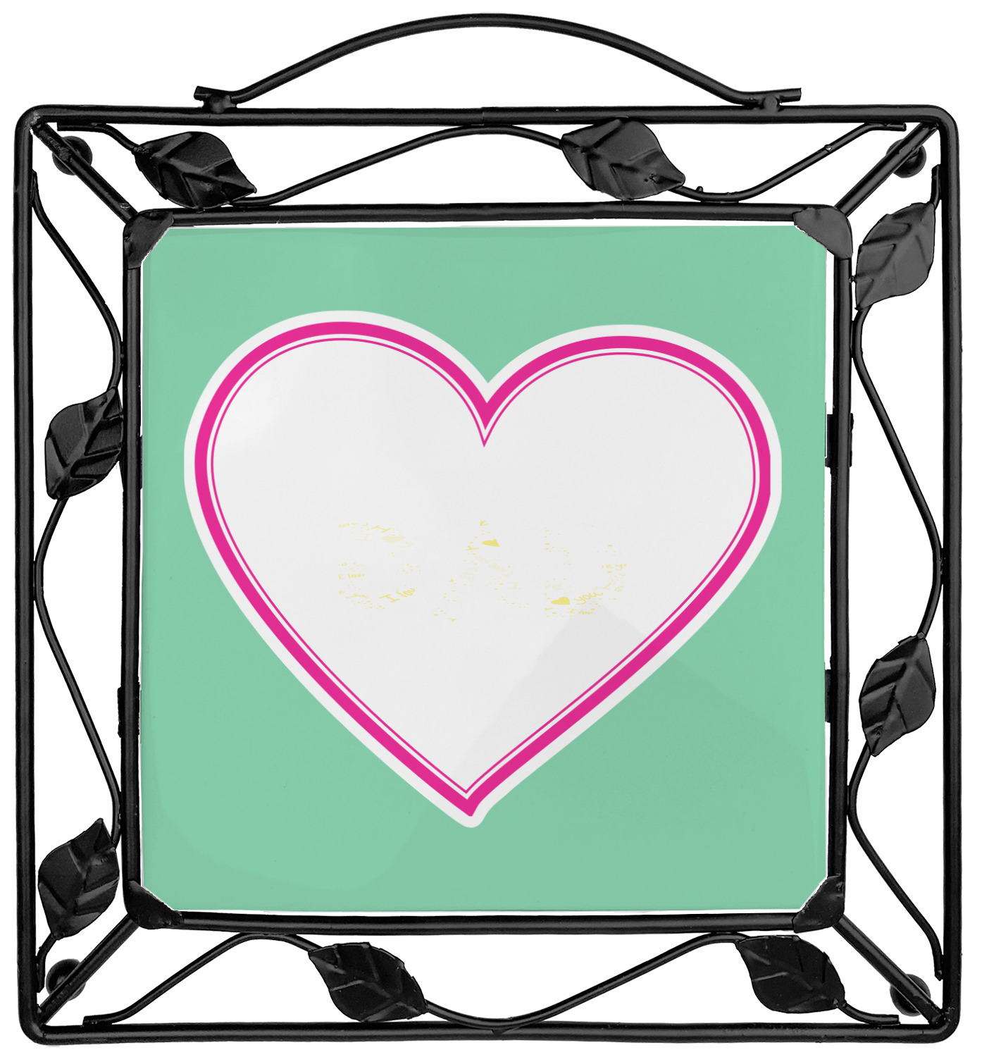 Our square trivets are made from a durable, wrought iron. This model features 4 small half circles, one on each corner, and a larger ring of iron that circles the central, customized tile. Each of the 4 corners has a round foot on its bottom for stability. This trivet is 8.75 by 8.75 inches, but the central tile measures at 6 inches on both sides.