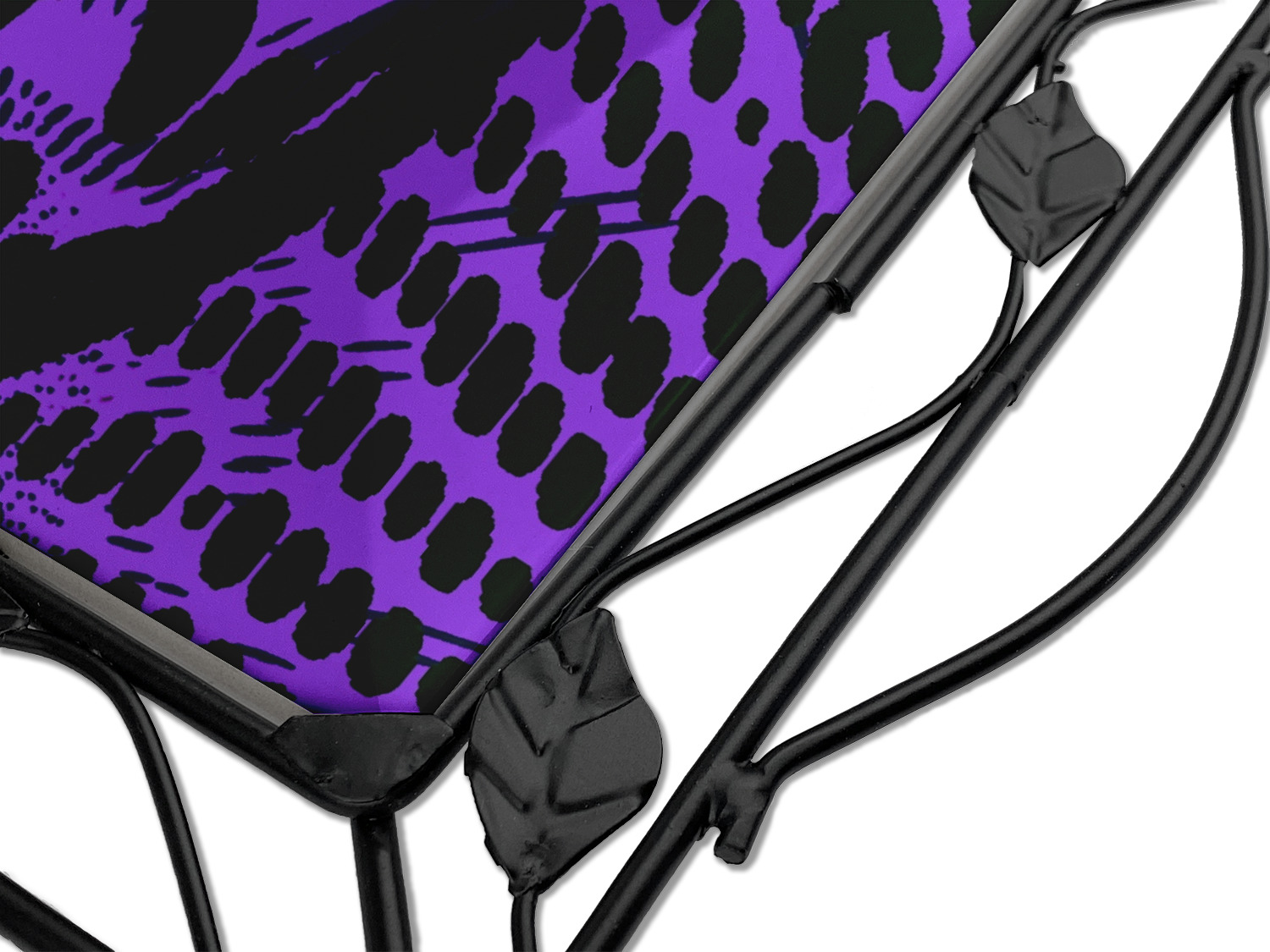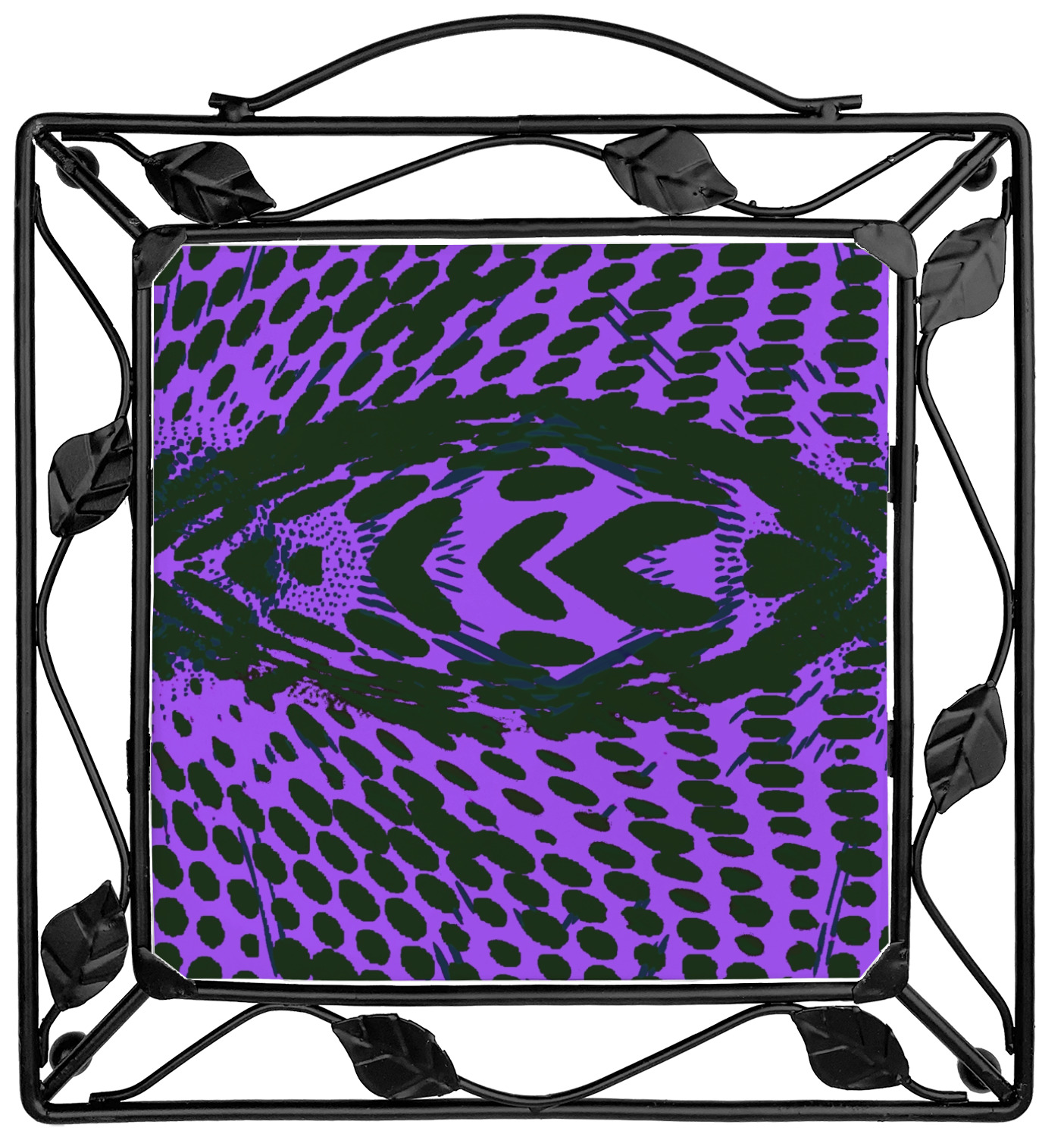 Our square trivets are made from a durable, wrought iron. This model features 4 small half circles, one on each corner, and a larger ring of iron that circles the central, customized tile. Each of the 4 corners has a round foot on its bottom for stability. This trivet is 8.75 by 8.75 inches, but the central tile measures at 6 inches on both sides.