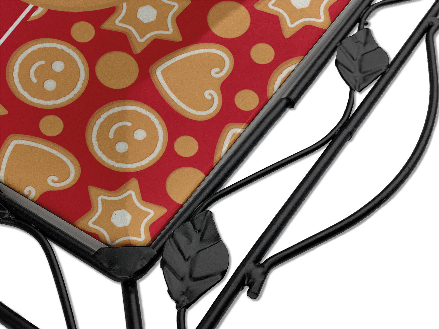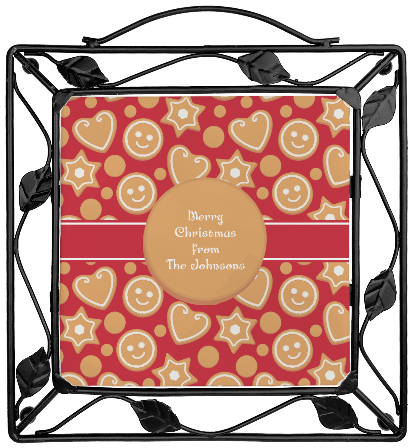 Our square trivets are made from a durable, wrought iron. This model features 4 small half circles, one on each corner, and a larger ring of iron that circles the central, customized tile. Each of the 4 corners has a round foot on its bottom for stability. This trivet is 8.75 by 8.75 inches, but the central tile measures at 6 inches on both sides.