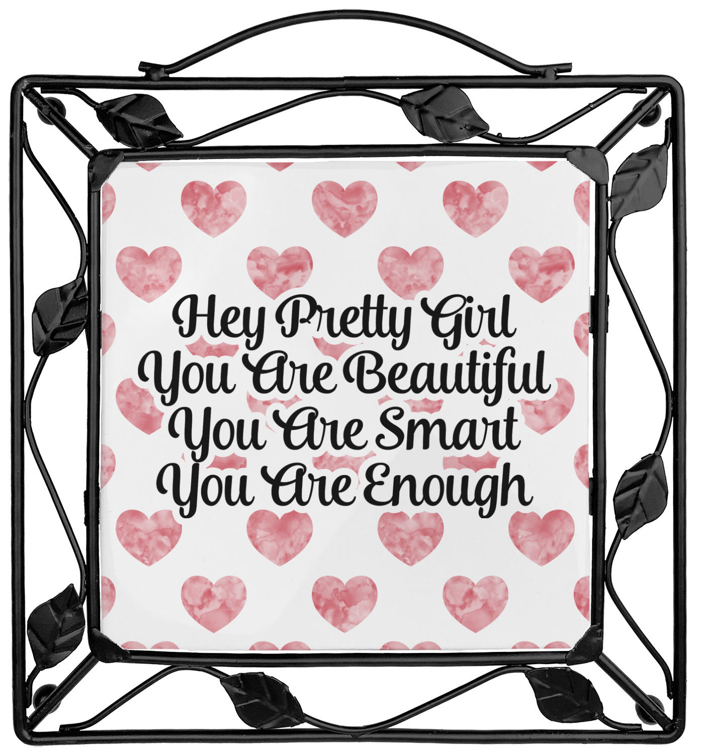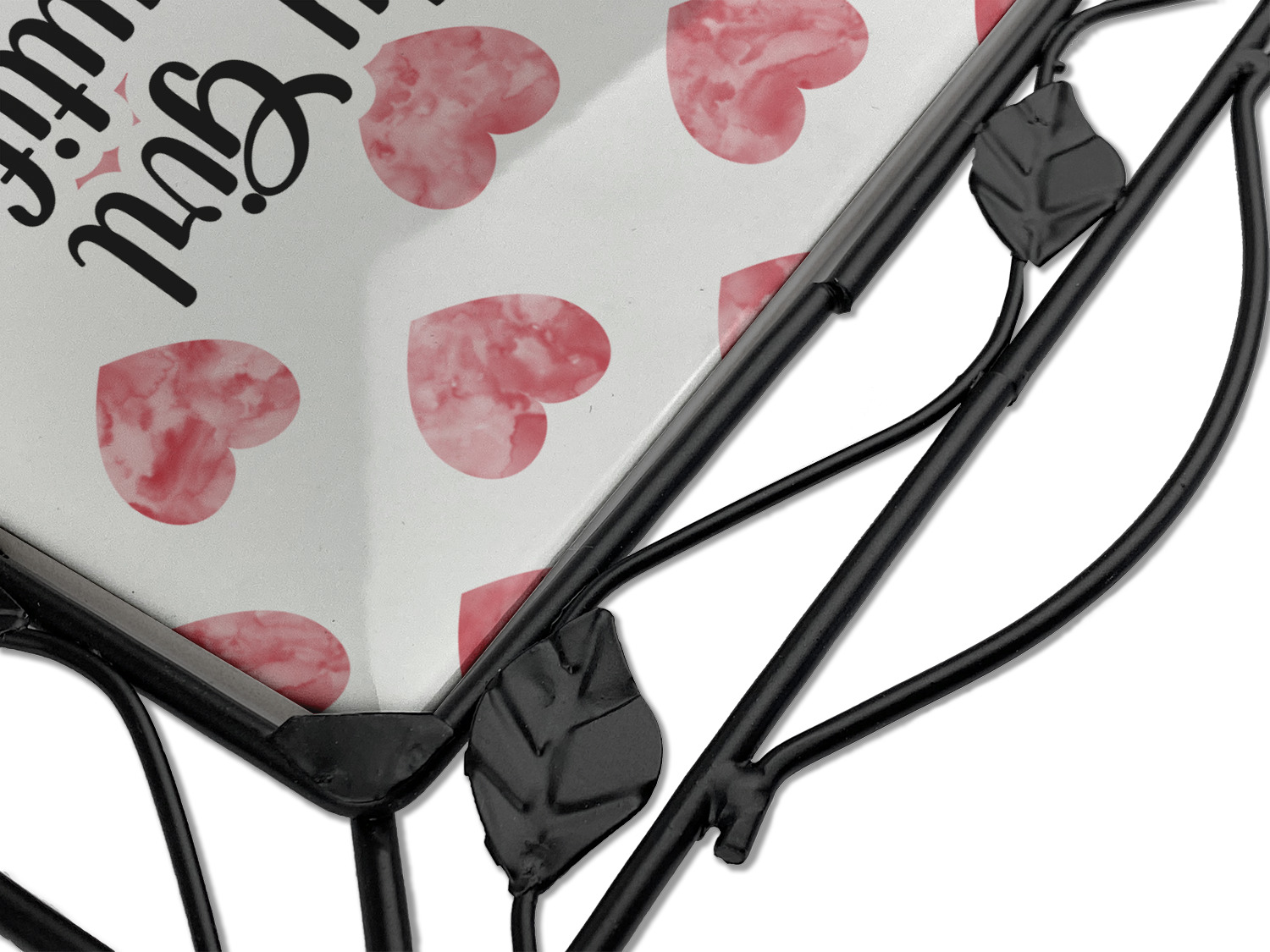 Our square trivets are made from a durable, wrought iron. This model features 4 small half circles, one on each corner, and a larger ring of iron that circles the central, customized tile. Each of the 4 corners has a round foot on its bottom for stability. This trivet is 8.75 by 8.75 inches, but the central tile measures at 6 inches on both sides.