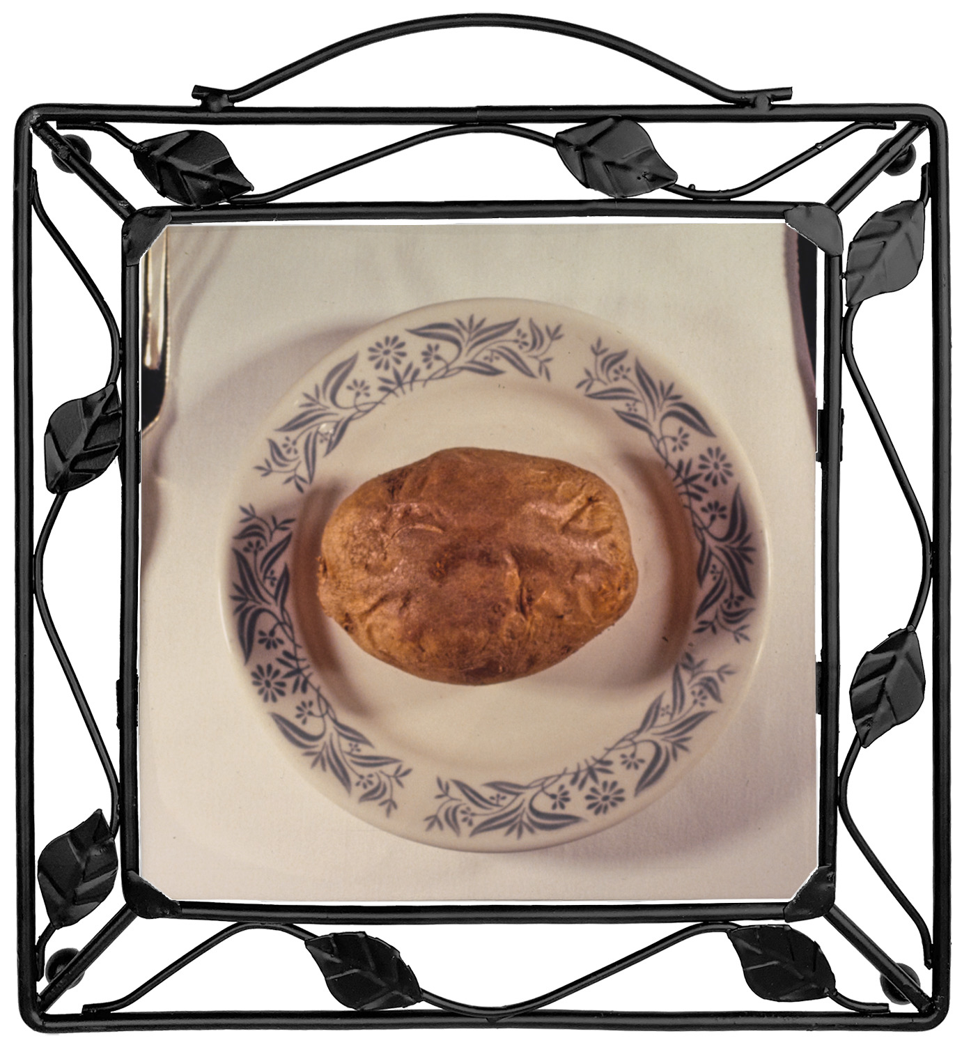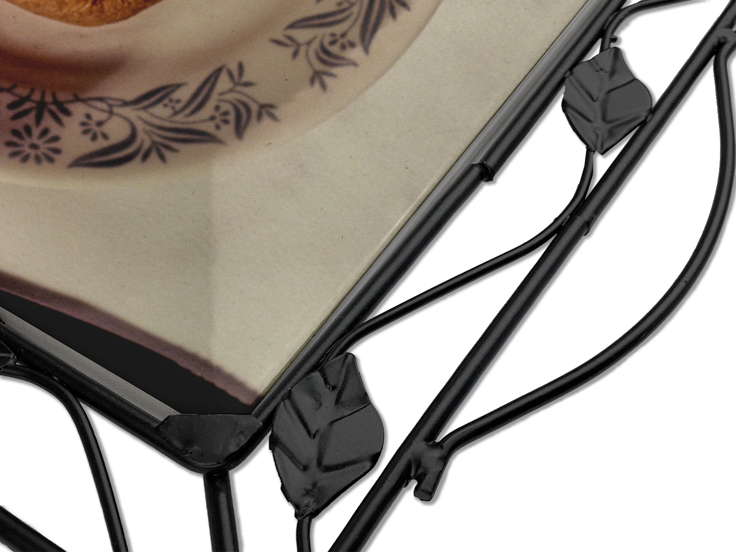 Our square trivets are made from a durable, wrought iron. This model features 4 small half circles, one on each corner, and a larger ring of iron that circles the central, customized tile. Each of the 4 corners has a round foot on its bottom for stability. This trivet is 8.75 by 8.75 inches, but the central tile measures at 6 inches on both sides.