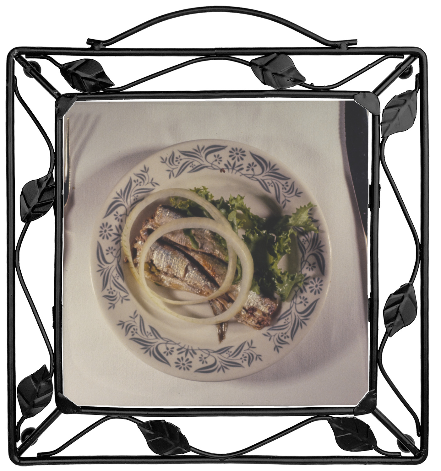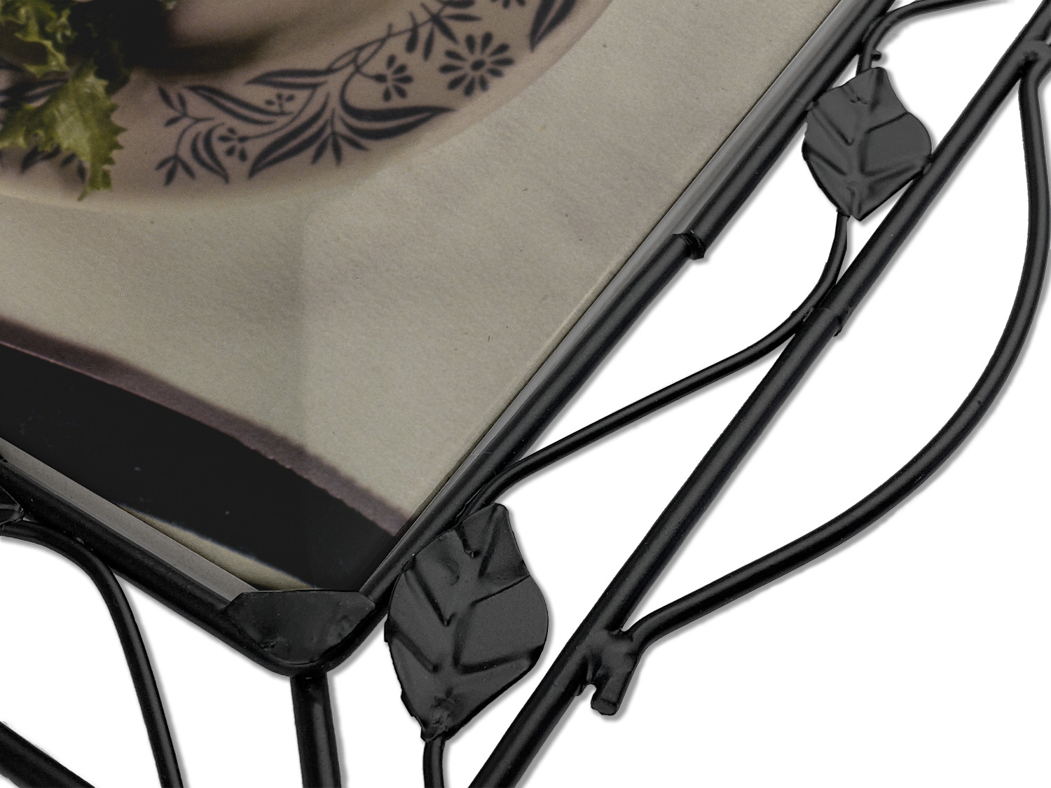 Our square trivets are made from a durable, wrought iron. This model features 4 small half circles, one on each corner, and a larger ring of iron that circles the central, customized tile. Each of the 4 corners has a round foot on its bottom for stability. This trivet is 8.75 by 8.75 inches, but the central tile measures at 6 inches on both sides.