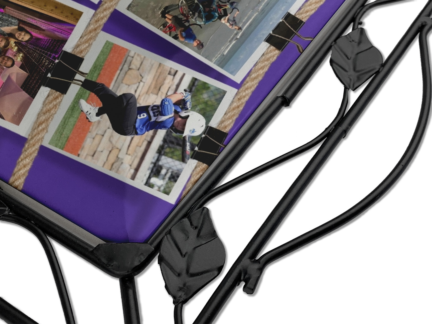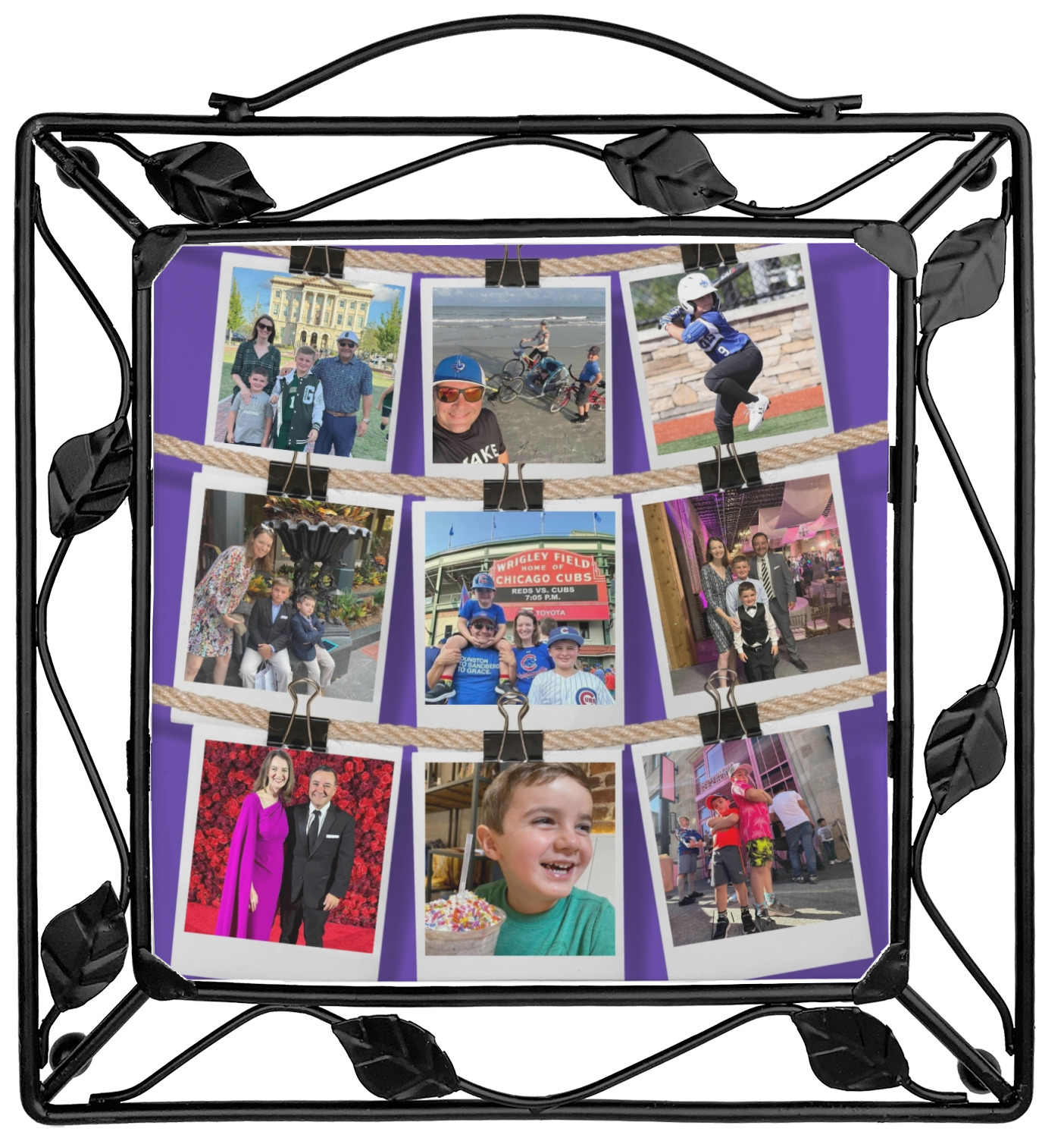 Our square trivets are made from a durable, wrought iron. This model features 4 small half circles, one on each corner, and a larger ring of iron that circles the central, customized tile. Each of the 4 corners has a round foot on its bottom for stability. This trivet is 8.75 by 8.75 inches, but the central tile measures at 6 inches on both sides.
