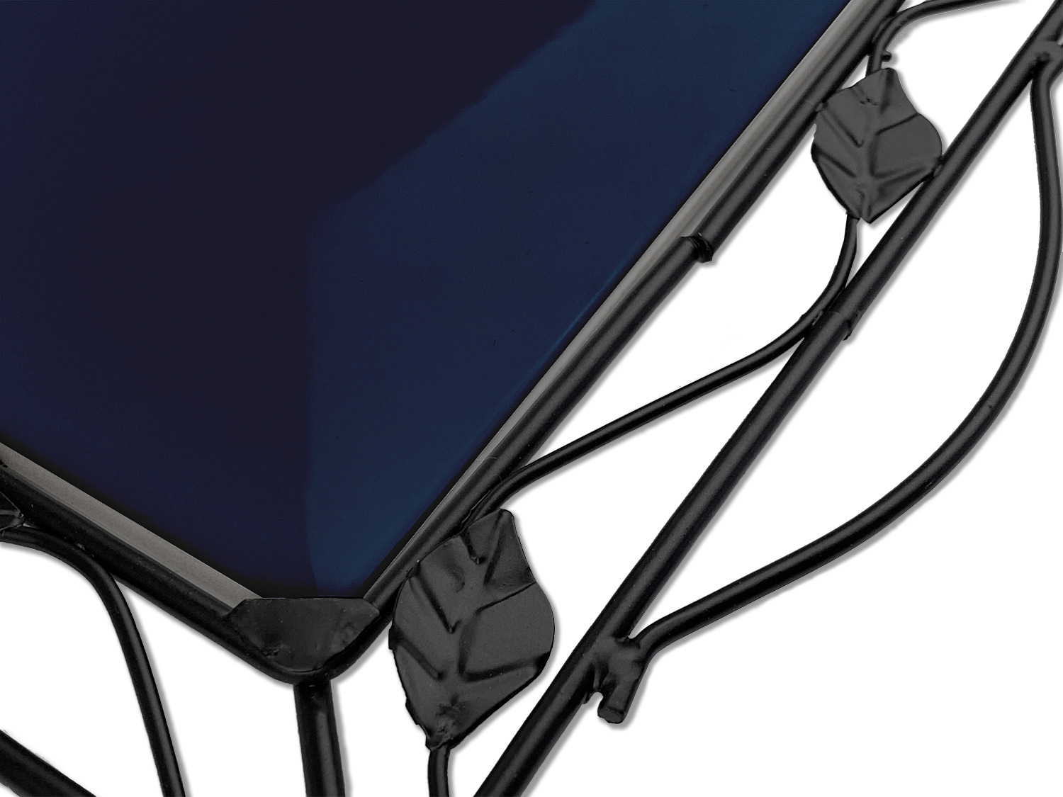 Our square trivets are made from a durable, wrought iron. This model features 4 small half circles, one on each corner, and a larger ring of iron that circles the central, customized tile. Each of the 4 corners has a round foot on its bottom for stability. This trivet is 8.75 by 8.75 inches, but the central tile measures at 6 inches on both sides.