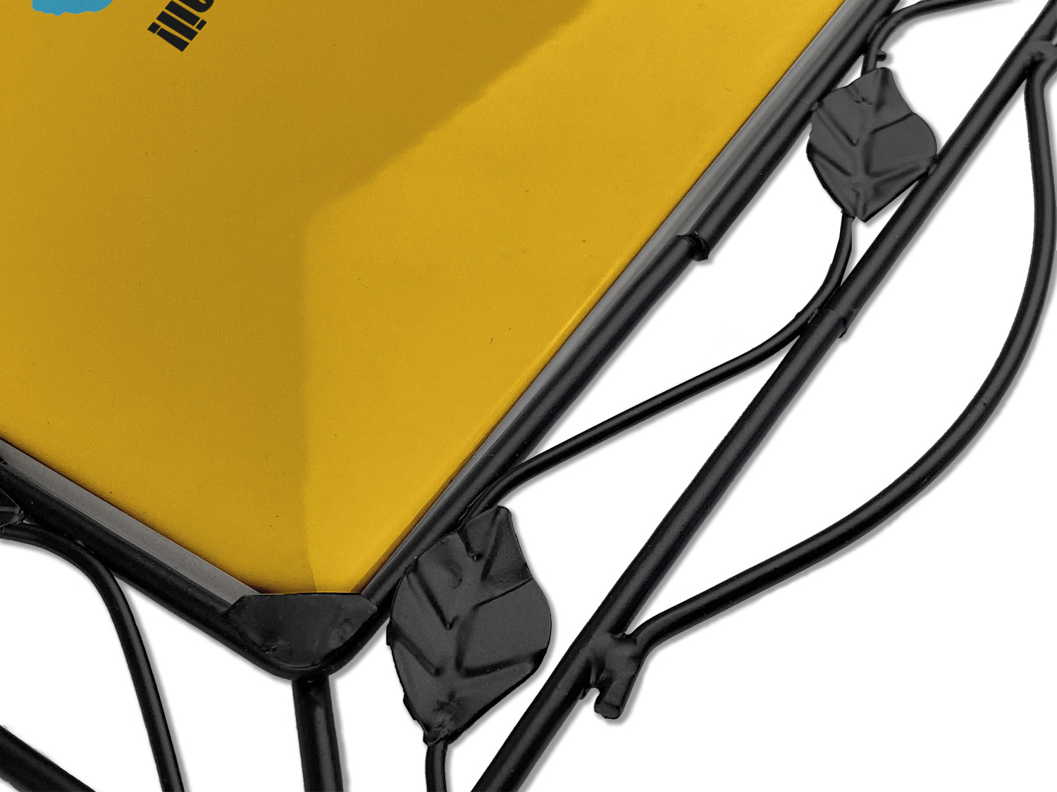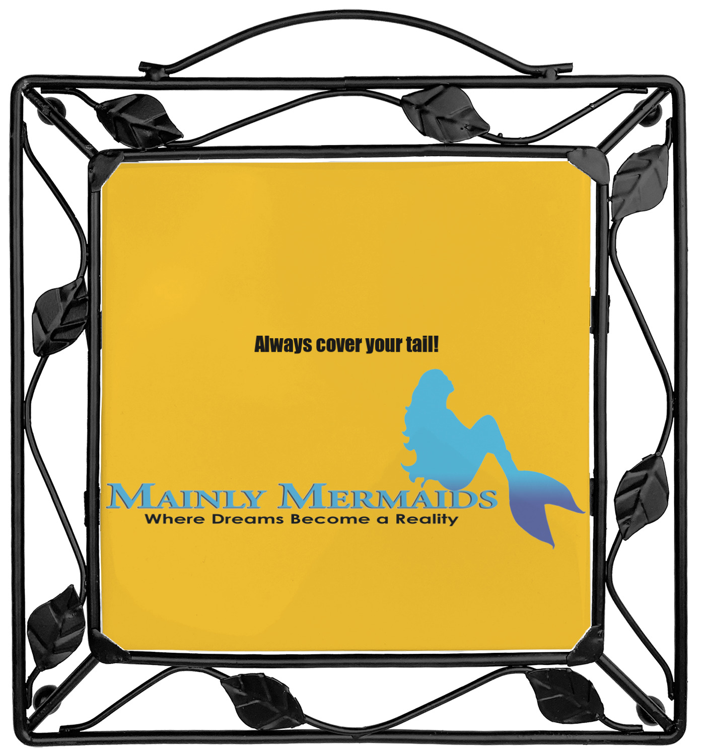 Our square trivets are made from a durable, wrought iron. This model features 4 small half circles, one on each corner, and a larger ring of iron that circles the central, customized tile. Each of the 4 corners has a round foot on its bottom for stability. This trivet is 8.75 by 8.75 inches, but the central tile measures at 6 inches on both sides.