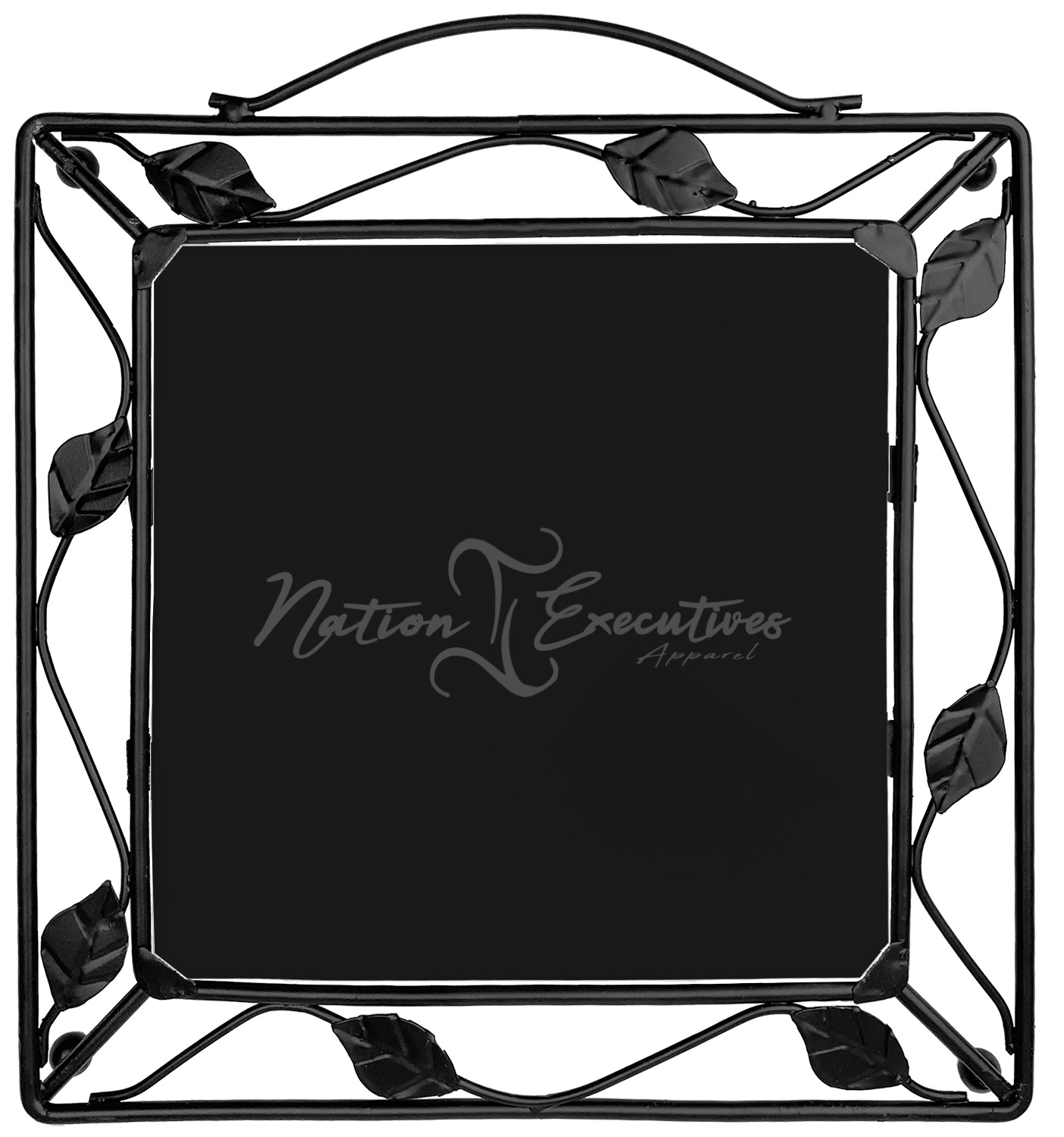 Our square trivets are made from a durable, wrought iron. This model features 4 small half circles, one on each corner, and a larger ring of iron that circles the central, customized tile. Each of the 4 corners has a round foot on its bottom for stability. This trivet is 8.75 by 8.75 inches, but the central tile measures at 6 inches on both sides.