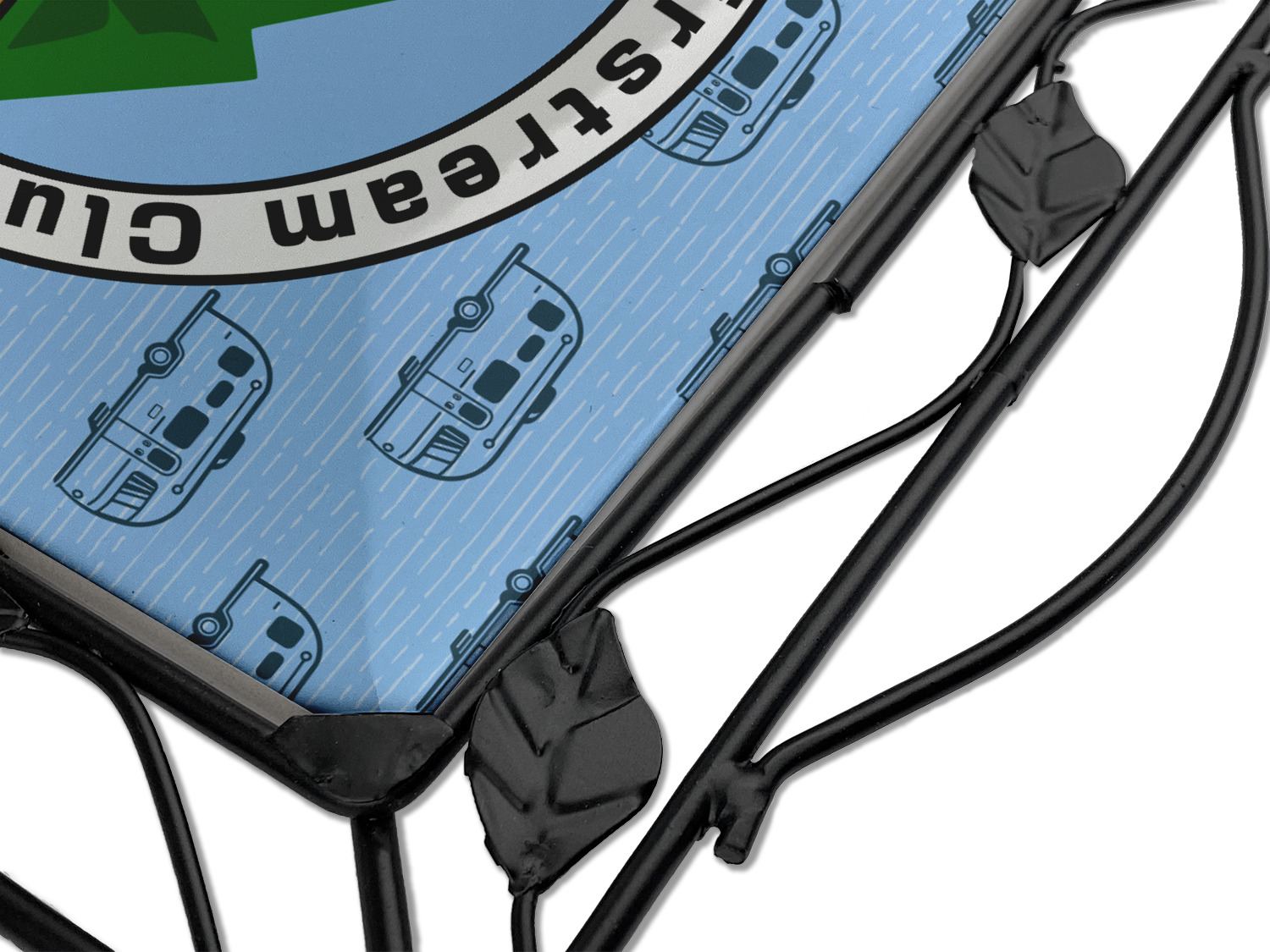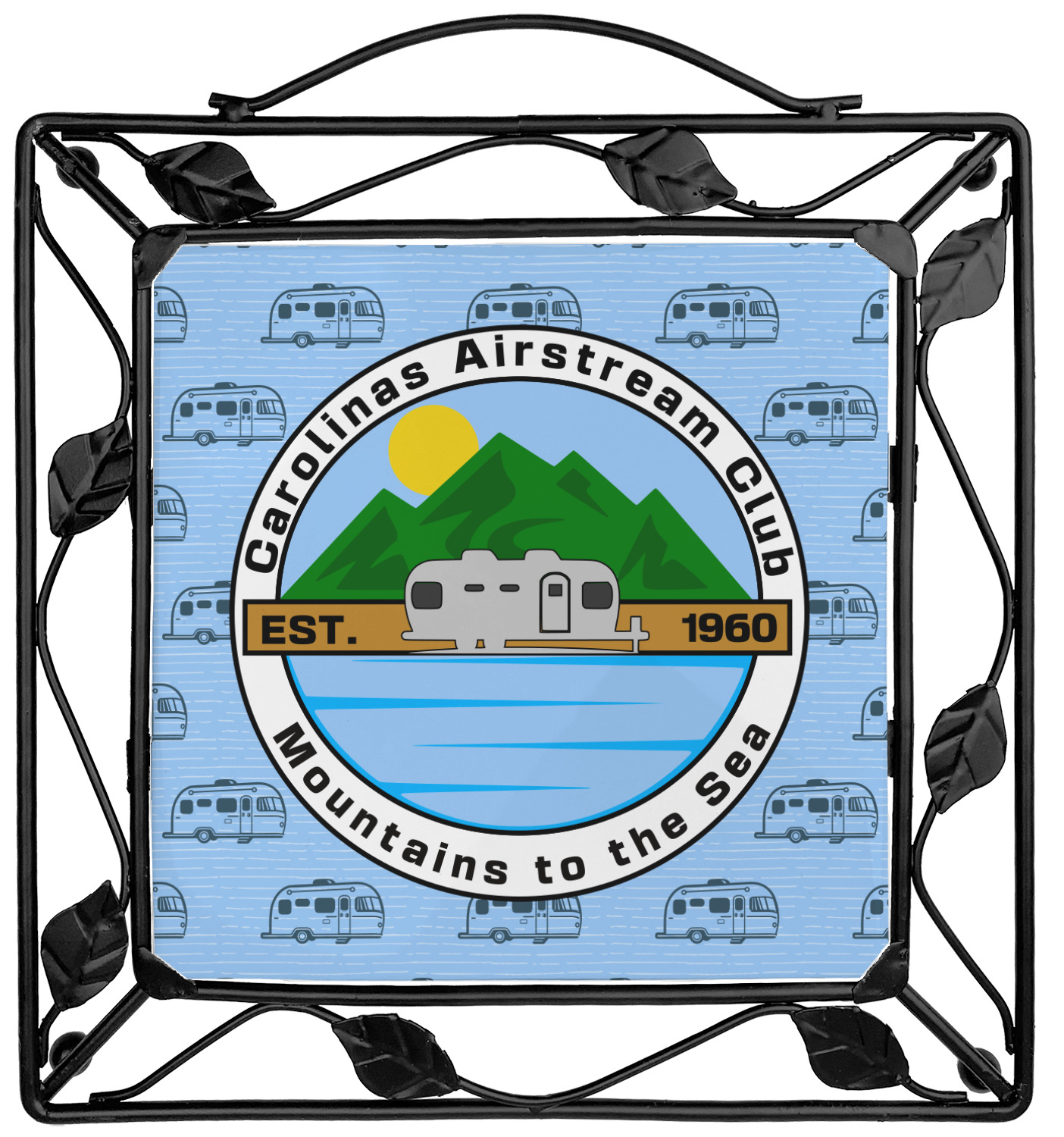 Our square trivets are made from a durable, wrought iron. This model features 4 small half circles, one on each corner, and a larger ring of iron that circles the central, customized tile. Each of the 4 corners has a round foot on its bottom for stability. This trivet is 8.75 by 8.75 inches, but the central tile measures at 6 inches on both sides.