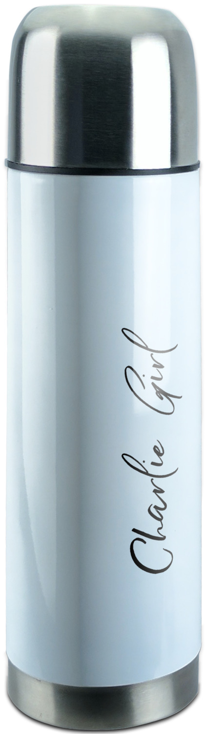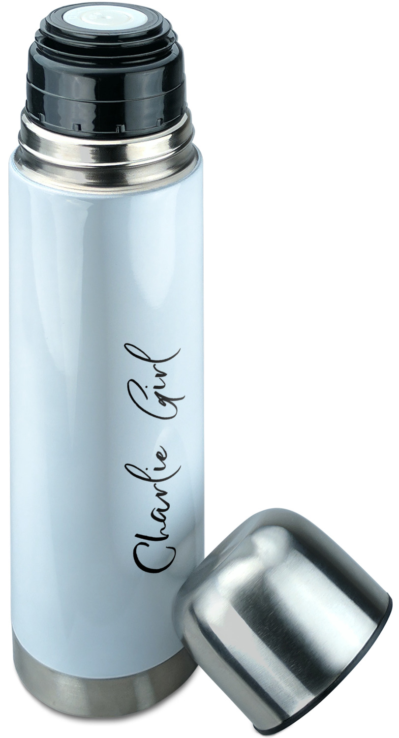 Manufactured from stainless steel, this thermos is built durably and double-walled insulated to preserve the temperature of your drink for hours. It also features a screw off lid that is made to also function as a small cup. Upon unscrewing this part of the thermos bottle, a pop-open, pour feature emerges. This feature allows you to slowly pour your beverage into your lid, ensuring a steady, controlled pour into your lid or other cup. With a capacity of 25 ounces, these large thermoses can hold several servings of your favorite beverage. Your customization is displayed all around the bottle with bright, vibrant color.