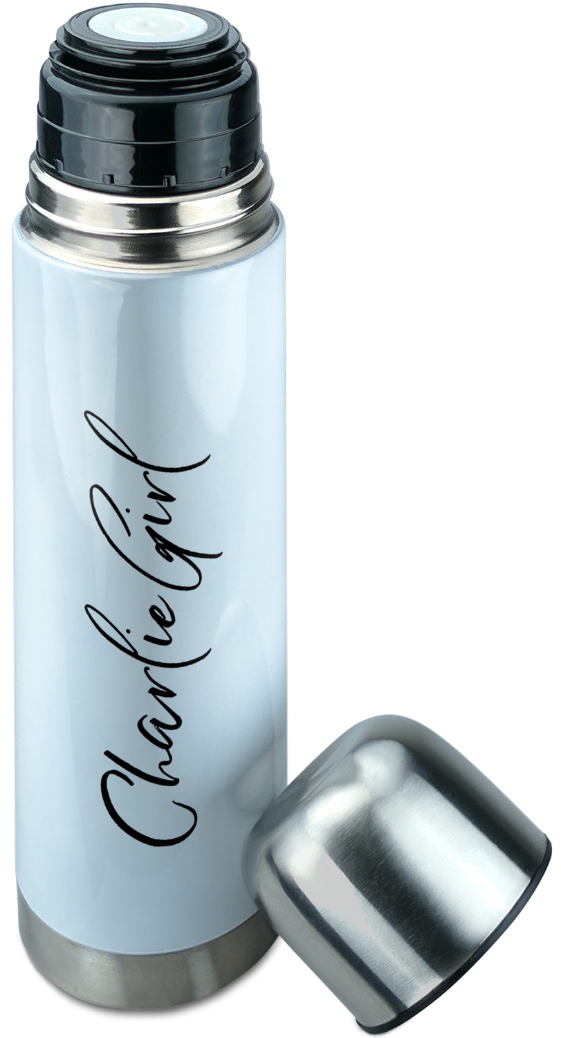 Manufactured from stainless steel, this thermos is built durably and double-walled insulated to preserve the temperature of your drink for hours. It also features a screw off lid that is made to also function as a small cup. Upon unscrewing this part of the thermos bottle, a pop-open, pour feature emerges. This feature allows you to slowly pour your beverage into your lid, ensuring a steady, controlled pour into your lid or other cup. With a capacity of 25 ounces, these large thermoses can hold several servings of your favorite beverage. Your customization is displayed all around the bottle with bright, vibrant color.