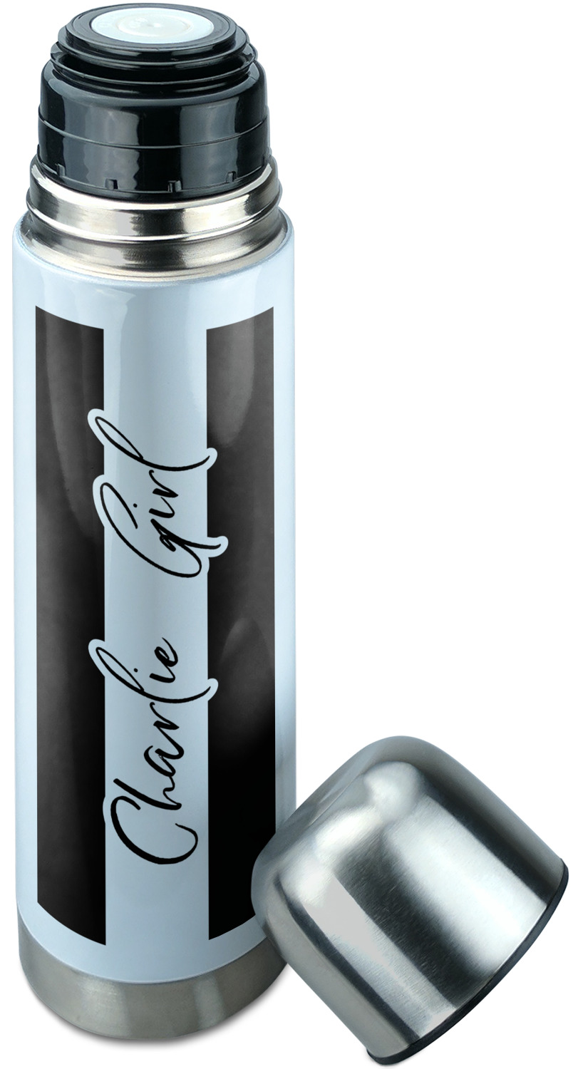 Manufactured from stainless steel, this thermos is built durably and double-walled insulated to preserve the temperature of your drink for hours. It also features a screw off lid that is made to also function as a small cup. Upon unscrewing this part of the thermos bottle, a pop-open, pour feature emerges. This feature allows you to slowly pour your beverage into your lid, ensuring a steady, controlled pour into your lid or other cup. With a capacity of 25 ounces, these large thermoses can hold several servings of your favorite beverage. Your customization is displayed all around the bottle with bright, vibrant color.