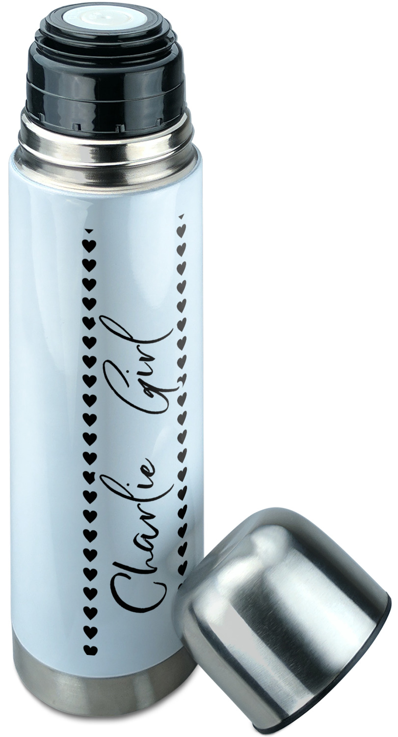 Manufactured from stainless steel, this thermos is built durably and double-walled insulated to preserve the temperature of your drink for hours. It also features a screw off lid that is made to also function as a small cup. Upon unscrewing this part of the thermos bottle, a pop-open, pour feature emerges. This feature allows you to slowly pour your beverage into your lid, ensuring a steady, controlled pour into your lid or other cup. With a capacity of 25 ounces, these large thermoses can hold several servings of your favorite beverage. Your customization is displayed all around the bottle with bright, vibrant color.