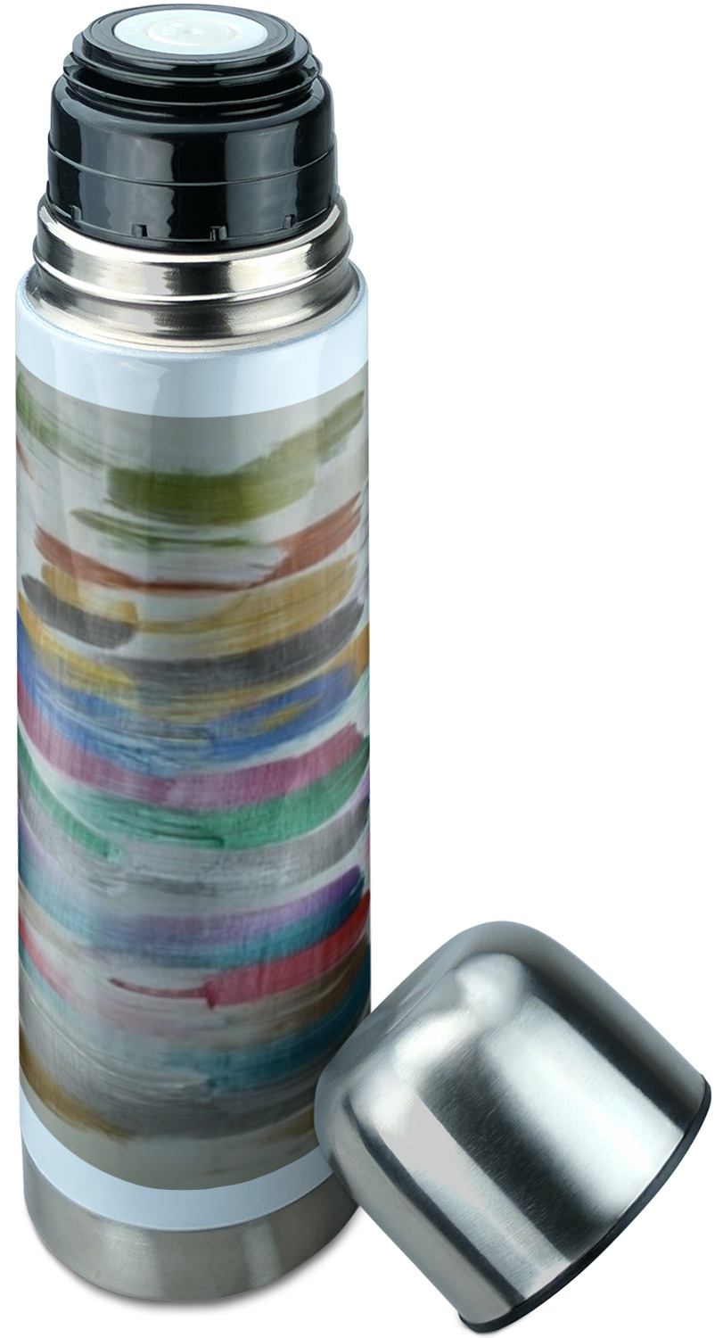 Manufactured from stainless steel, this thermos is built durably and double-walled insulated to preserve the temperature of your drink for hours. It also features a screw off lid that is made to also function as a small cup. Upon unscrewing this part of the thermos bottle, a pop-open, pour feature emerges. This feature allows you to slowly pour your beverage into your lid, ensuring a steady, controlled pour into your lid or other cup. With a capacity of 25 ounces, these large thermoses can hold several servings of your favorite beverage. Your customization is displayed all around the bottle with bright, vibrant color.