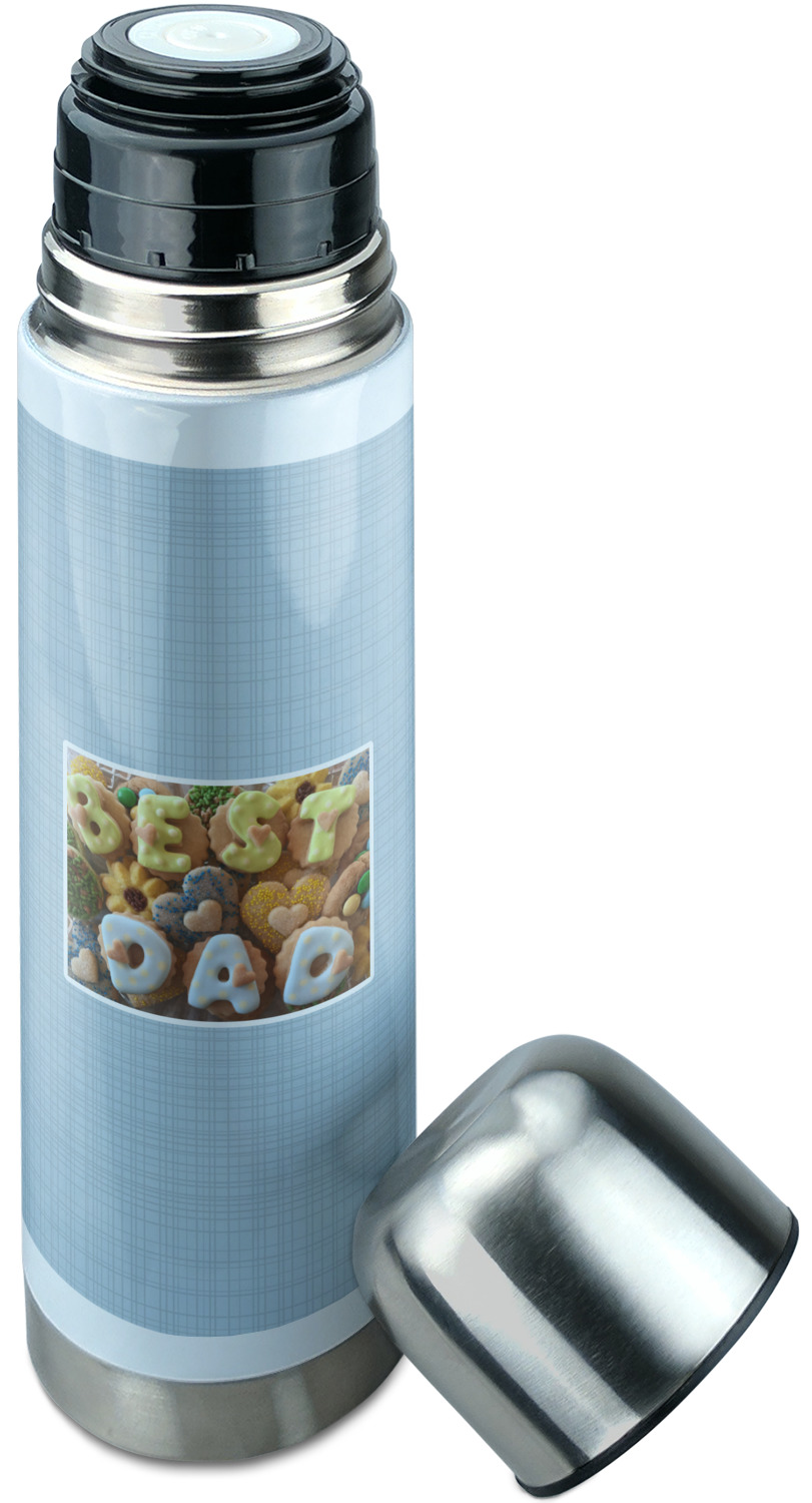 Manufactured from stainless steel, this thermos is built durably and double-walled insulated to preserve the temperature of your drink for hours. It also features a screw off lid that is made to also function as a small cup. Upon unscrewing this part of the thermos bottle, a pop-open, pour feature emerges. This feature allows you to slowly pour your beverage into your lid, ensuring a steady, controlled pour into your lid or other cup. With a capacity of 25 ounces, these large thermoses can hold several servings of your favorite beverage. Your customization is displayed all around the bottle with bright, vibrant color.