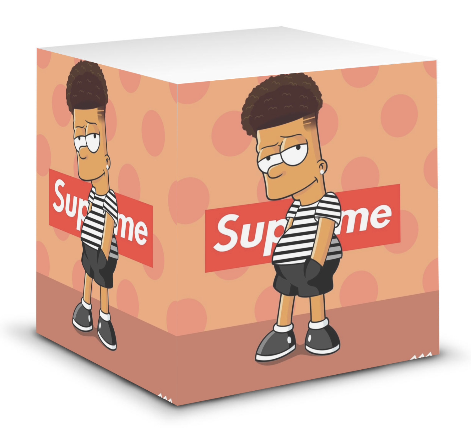 This note cube features 700 sheets of matte, white paper. Each sheet measures at 3.5 by 3.5 inches and has an adhesive strip at its top. Your personalized design is displayed on all four edges of the sticky pad.