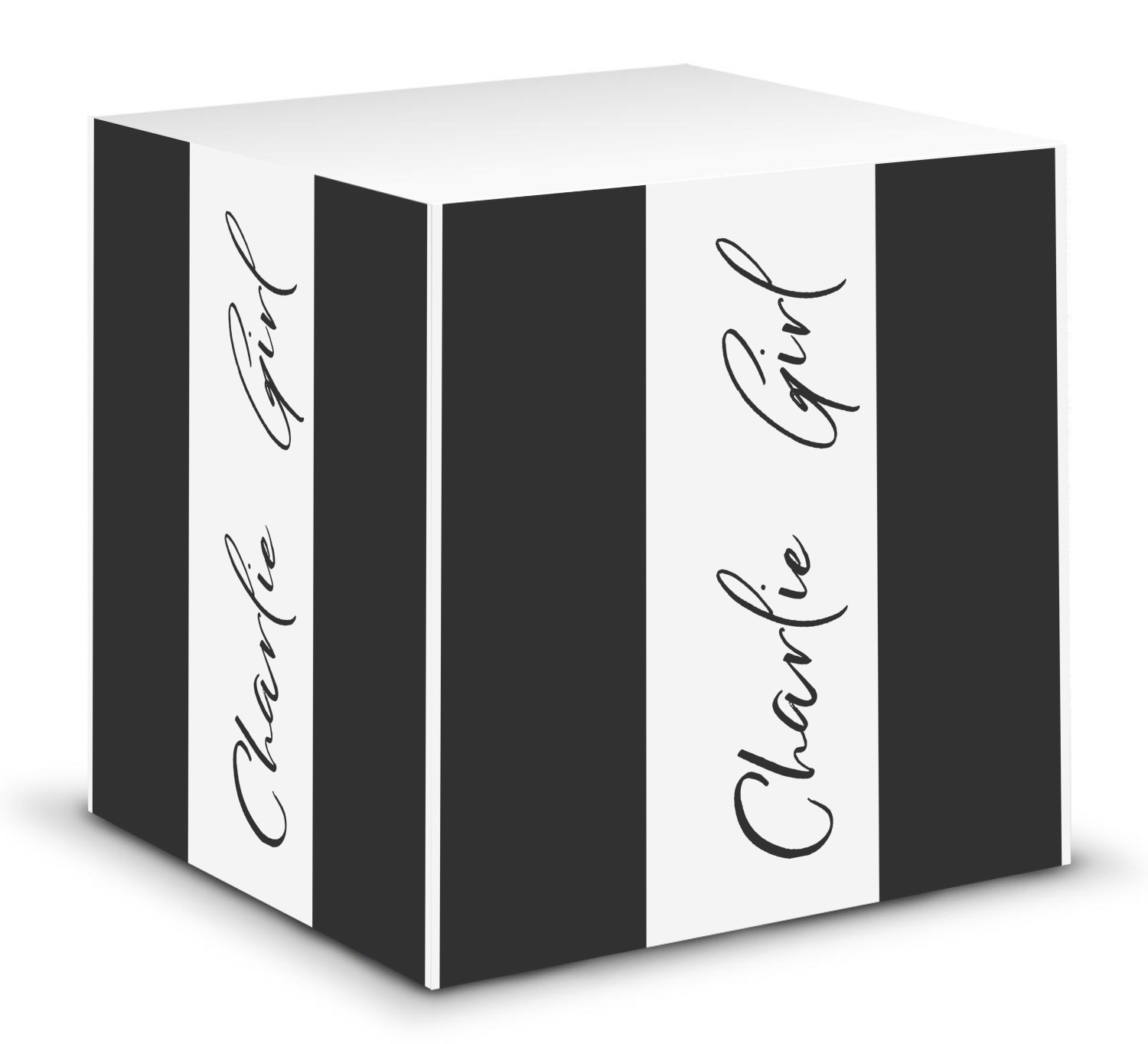 This note cube features 700 sheets of matte, white paper. Each sheet measures at 3.5 by 3.5 inches and has an adhesive strip at its top. Your personalized design is displayed on all four edges of the sticky pad.