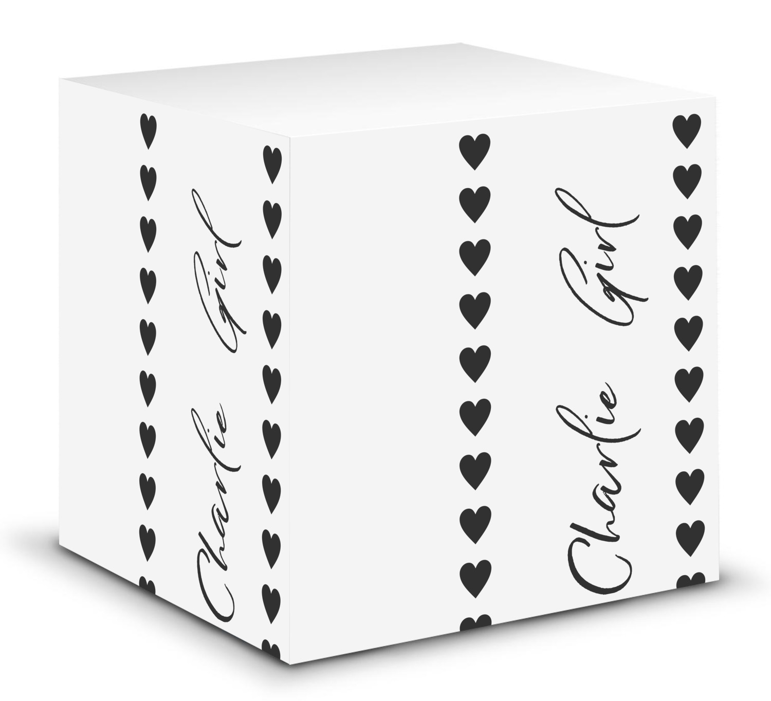 This note cube features 700 sheets of matte, white paper. Each sheet measures at 3.5 by 3.5 inches and has an adhesive strip at its top. Your personalized design is displayed on all four edges of the sticky pad.