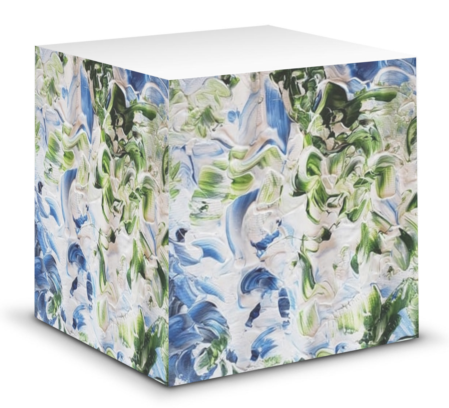 This note cube features 700 sheets of matte, white paper. Each sheet measures at 3.5 by 3.5 inches and has an adhesive strip at its top. Your personalized design is displayed on all four edges of the sticky pad.