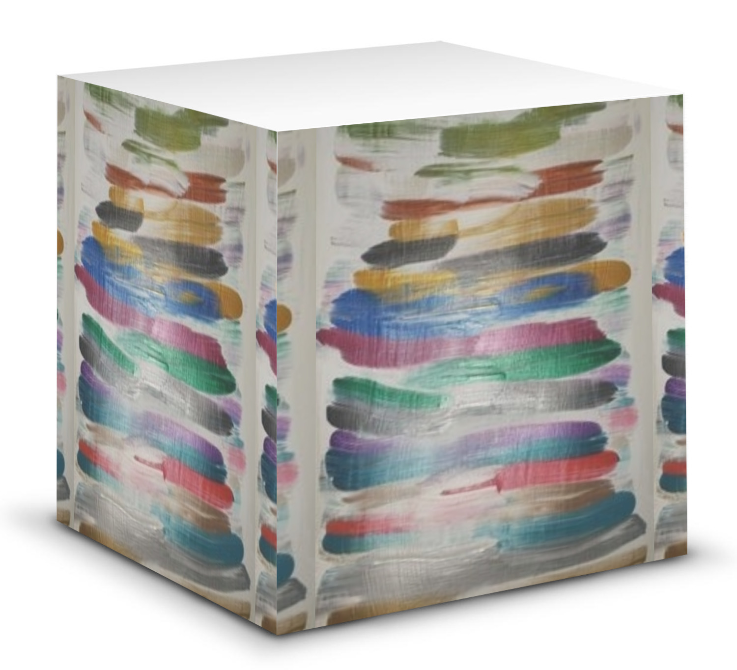 This note cube features 700 sheets of matte, white paper. Each sheet measures at 3.5 by 3.5 inches and has an adhesive strip at its top. Your personalized design is displayed on all four edges of the sticky pad.
