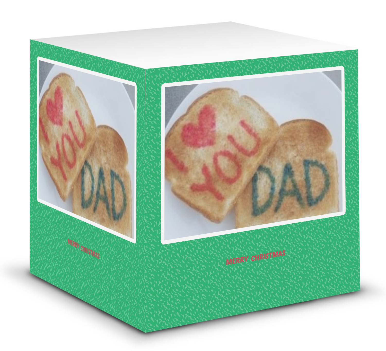 This note cube features 700 sheets of matte, white paper. Each sheet measures at 3.5 by 3.5 inches and has an adhesive strip at its top. Your personalized design is displayed on all four edges of the sticky pad.