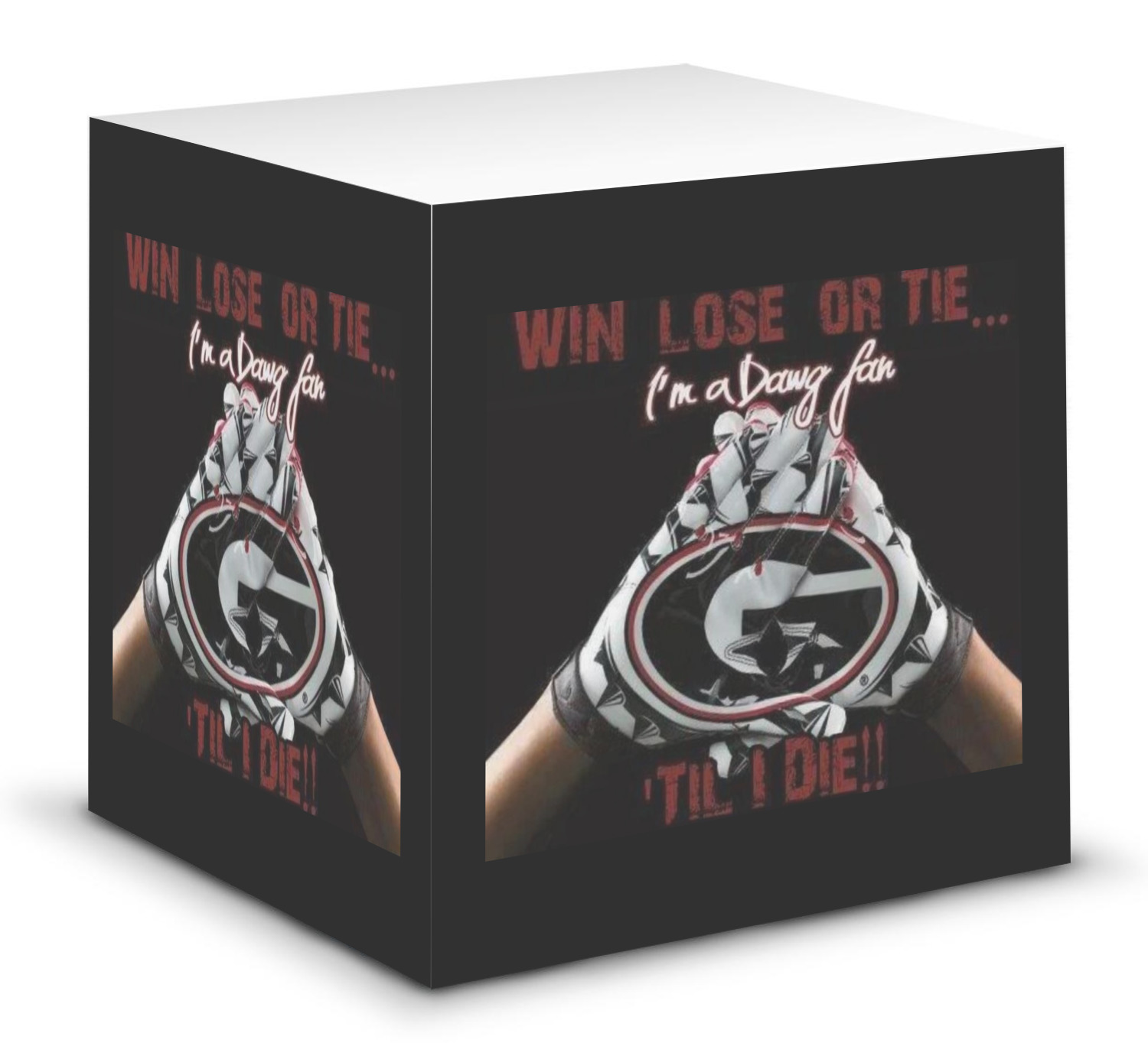This note cube features 700 sheets of matte, white paper. Each sheet measures at 3.5 by 3.5 inches and has an adhesive strip at its top. Your personalized design is displayed on all four edges of the sticky pad.
